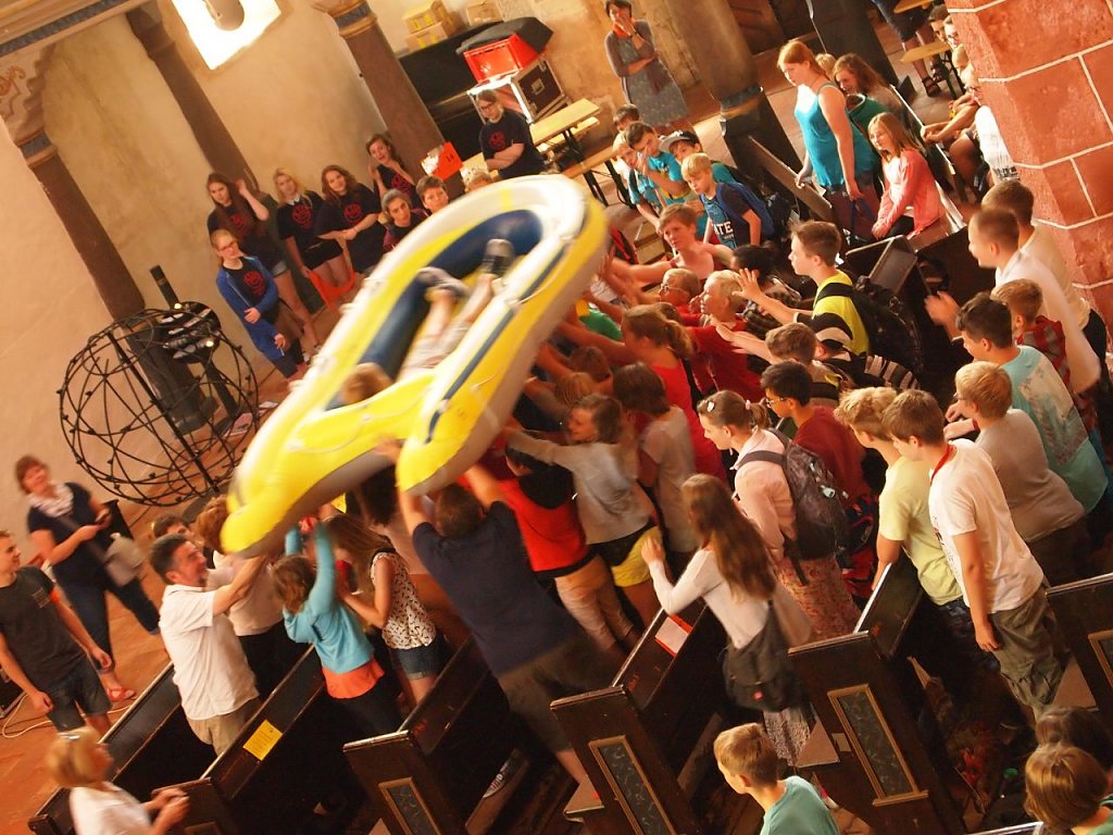 Zum diesjährigen Kirchenentdeckertag des Kirchenkreises Südharz haben gut 400 Kinder die Blasii-Kirche in Nordhausen erobert. Schüler aus Förder-, Regelschulen und Gymnasien aus Niedersachswerfen, Breitenworbis, Bleicherode und Nordhausen hatten Lust einen Vormittag lang Kirche zu entdecken. Und schon die Begrüßung machte Lust auf mehr. Die Band der Herzschlag-Jugendkirche Heartrock rockte die Kirche mit Licht- und Nebeleffekten. Unter großem Gejohle ließ Jugendreferent Simon Roppel dann zwei Schüler im Schlauchboot churchdiven. Von Hand zu Hand wurden sie im Boot über den Köpfen durch die Bankreihen weitergereicht. Was das mit Kirche zu tun hat, erklärte er den staunenden Kids so: Wenn das Leben mal wieder chaotisch erscheint und du dir vorkommst wie allein auf hoher See, dann ist die Kirche wie ein sicheres Boot. Emilys und Jasons Vertrauen wurde belohnt, sie landeten, nach ihrer schaukelnden Reise hoch über den Köpfen, sicher auf dem Boden.