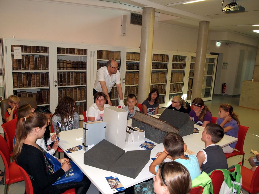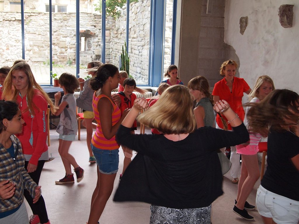 Hinterher gab es an 16 Orten in der Stadt viel zu entdecken. Dreißig Workshops waren vorbereitet, von der Entdeckung der Himmelgarten-Bibliothek mit Dr. Theilemann in der Flohburg, über das Erkunden von Sexualität und Liebe in der Bibel mit Gemeindepädagogin Carmen Scholl bis hin zur Suchtberatung der Diakonie, dem Schreiben mit einer Feder wie zu Luthers Zeiten und einem Improvisations-Workshop im Nordhäuser Theater. Insgesamt 30 Workshops boten von Bewegung bis Bildung für jeden etwas. Viele kirchliche und kirchennahe Organisationen haben daran mitgearbeitet, wie die Johanniter, die Diakonie, der Eine-Welt-Laden, die Nordthüringer Lebenshilfe und die Pfadfinder. Doch auch andere öffneten ihre Türen. Die Flohburg, der Tabakspeicher, das Theater, die Kulturbibliothek, die Jugendkunstschule und selbst das Rathaus brachten sich mit Räumen und Referenten ein. So begrüßte auch OB Dr. Klaus Zeh eine Workshop-Gruppe an der Blasii-Kirche und ging mit ihnen in sein Rathaus. Unter dem Motto: Wie nimmt der OB als Christ und Politiker Verantwortung in der Gesellschaft wahr? - Glaube und Politik passt das zusammen? durften ihn die Schüler nach Herzenslust ausfragen. Der Tag stand zudem ganz im Zeichen der Ökumene, denn auch der Dom hatte wieder seine Türen für die Kinder geöffnet. So führte der Gildemeister der Nordhäuser Gästeführergilde Winfried Wehrhan als Erzlutheraner, wie er sich selbst schmunzelnd bezeichnet, im Dom durch die Geschichte der Heiligen Mathilde. Am bewegendsten war jedoch das Gespräch mit Kiflo aus Eritrea. Einmal live mit einem Flüchtling zu sprechen, von seiner lebensgefährlichen Flucht und seiner Sehnsucht nach seinen Kindern zu hören, ließ niemanden kalt. Kiflo, einst Mathelehrer in seiner Heimat, gab geduldig Auskunft und ließ keine Frage unbeantwortet. In diesem Raum war es Mucksmäuschenstill.