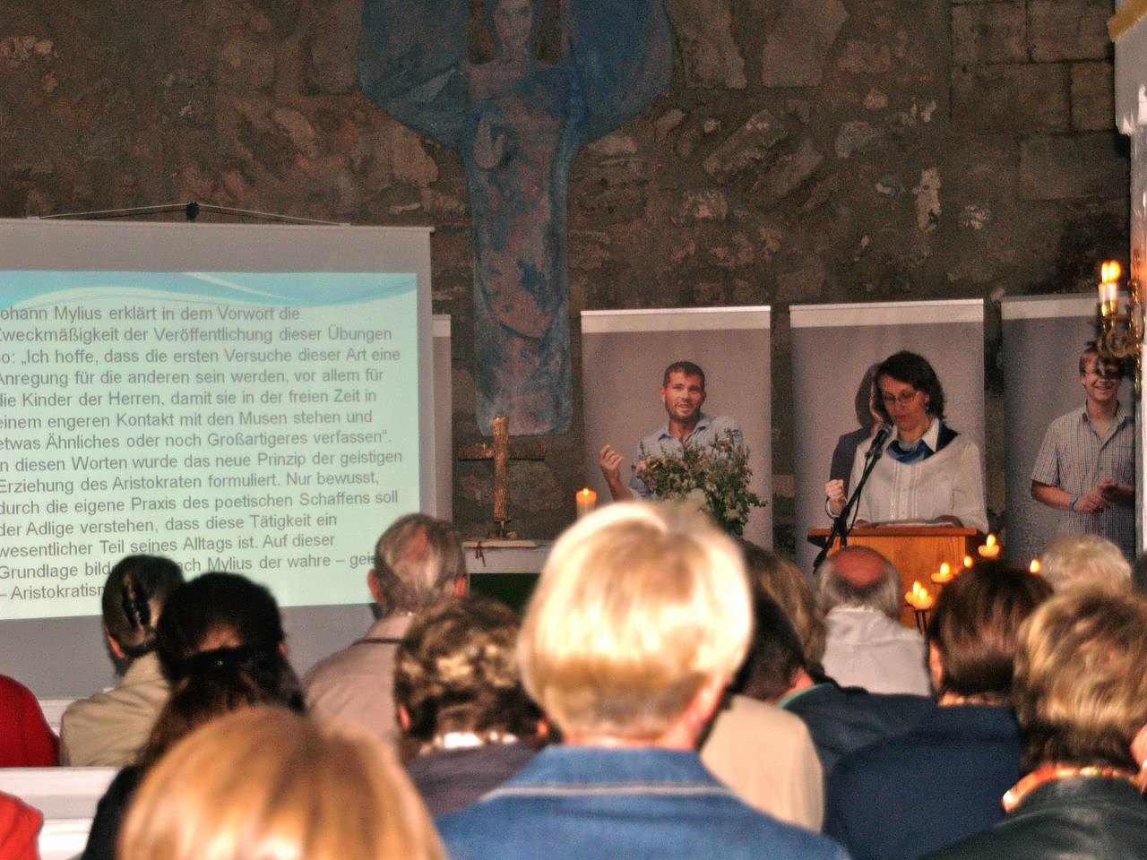 Die Altphilologin Prof. Dr. Nekrashevich-Karotkaja, die mit ihrer Familie aus Minsk/Weißrussland nach Liebenrode kam, tauchte die versammelte Gemeinde und unter ihnen, die Nachfahren der Myliusfamilie, sowie Mitglieder verschiedener Geschichtsvereine, in das Leben und den Zeitgeist, den Glauben und die Sehnsüchte des Johannes Mylius ein. Sie las und übersetzte aus den Büchern des Johannis Mülii Libenrodensis, sang, sprach seine Gebete, wie das Morgengebet aus seiner Gedichtsammlung "Nicht unelegante Gebete, in welchen sowohl morgens, als auch abends Jugendliche ihr Studium dem allmächtigen Gott anvertrauen, sowie um erfolgreiches Vorankommen in den Wissenschaften flehen können." Ein leises Lachen ging durch die Reihen bei diesem Beispiel: