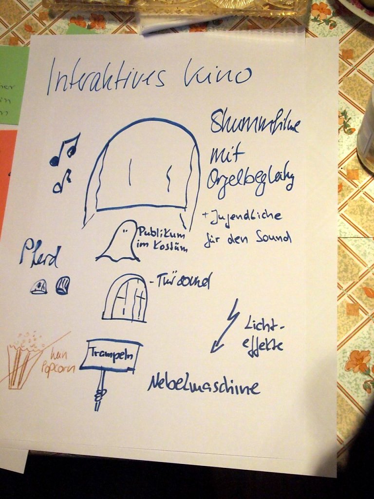 Heraus kam zum Beispiel das "Interaktive Kino" in der Kirche. Anders als einfache Kinovorführungen in der Kirche, die es ja bereits gibt, könnte das "Interaktive Kino" seine Zuschauer mit einbeziehen. Aber es wurde noch interessanter. Der Senior der Gruppe kam auf die Idee Stummfilme zu zeigen und diese mit Orgelmusik zu unterlegen. Genial, so wäre dieses schöne Instrument gleich mit einbezogen. Dazu könnten von Jugendlichen besondere Effekte einstudiert werden, die die Zuschauer überraschen - das Quietschen von Türen, das Geklapper von Pferdehufen. Der Spaß wäre vorprogrammiert. Und nicht zuletzt die Einbeziehung der Zuschauer - man könnte sie schon mit der Einladung bitten, zum Beispiel Taschenlampen mitzubringen. Hält ein Regiesseur dann ein Schild hoch mit dem Wort "Blitz" dann lassen beispielsweise alle Zuschauer ihre Lampen kurz aufblitzen. Ein toller Effekt. Sie könnten auch mit den Füßen trampeln, klatschen oder pfeifen. Vieles fiel der Gruppe ein. Doch der Senior setzte noch eine Idee drauf, er überlegte, die Zuschauer zu bitten in thematisch zum Film passenden Kostümen zu kommen. Wow!