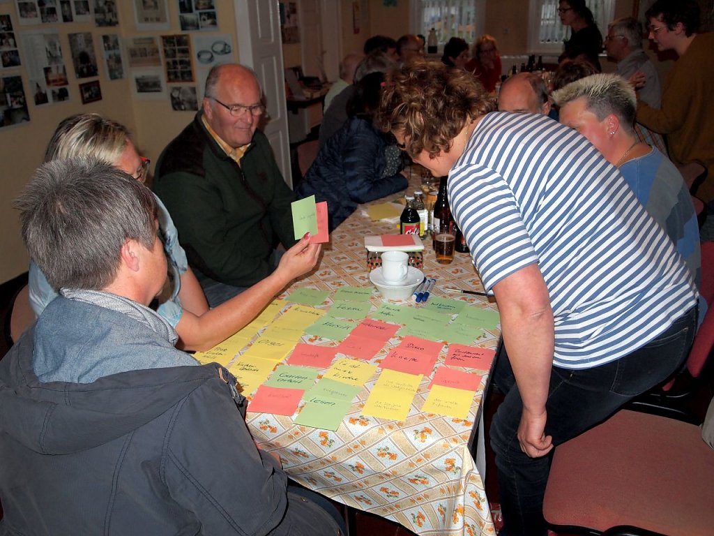 Die Mitarbeiterinnen Kira Soltani von chezweitz und Lisa-Marie Hottenrot von der EKM ließen die rund 20 Anwesenden aufschreiben, was sie privat gern tun, was sie in ihrem Ort vermissen und was sie an ihrer Kirche besonders schätzen.
