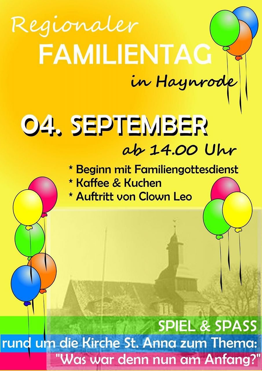 Der Familientag beginnt mit einem Familiengottesdienst, ganz klar, um 14.00 Uhr in der St. Anna Kirche in Haynrode. Danach gibt es viele Bastel- und Spielangebote, Kaffee & selbstgebackener Kuchen, und dann einer der Höhepunkte, unser Besuch, Clown Leo, der die Kinder garantiert begeistern und die Erwachsenen beeindrucken wird. Musik- und Orgelfreunde werden an diesem Nachmittag auch nicht zu kurz kommen. Ob jung oder alt, alleinstehend, oder Großfamilie, für jeden wird etwas dabei sein und alle sind herzlich willkommen!