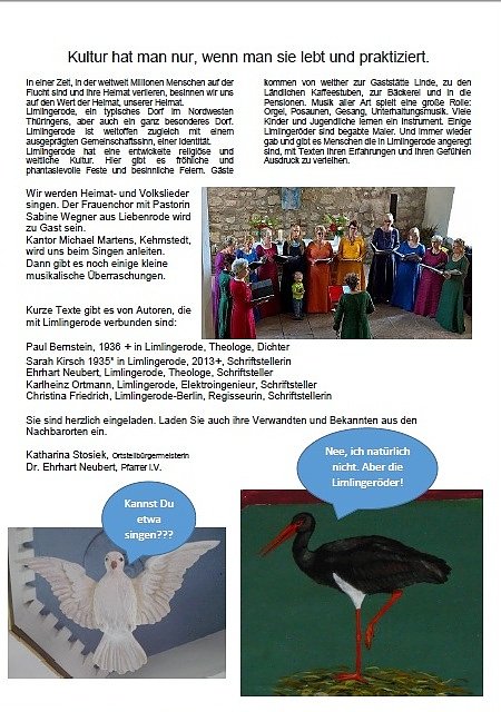 Es werden Heimat- und Volkslieder gesungen. Der Frauenchor mit Pastorin Sabine Wegner aus Liebenrode wird zu Gast sein. Kantor Michael Martens, Kehmstedt, wird uns beim Singen anleiten. Dann gibt es noch einige kleine musikalische Überraschungen. Außerdem werden kurze Texte von Autoren gelesen, die mit Limlingerode verbunden sind.