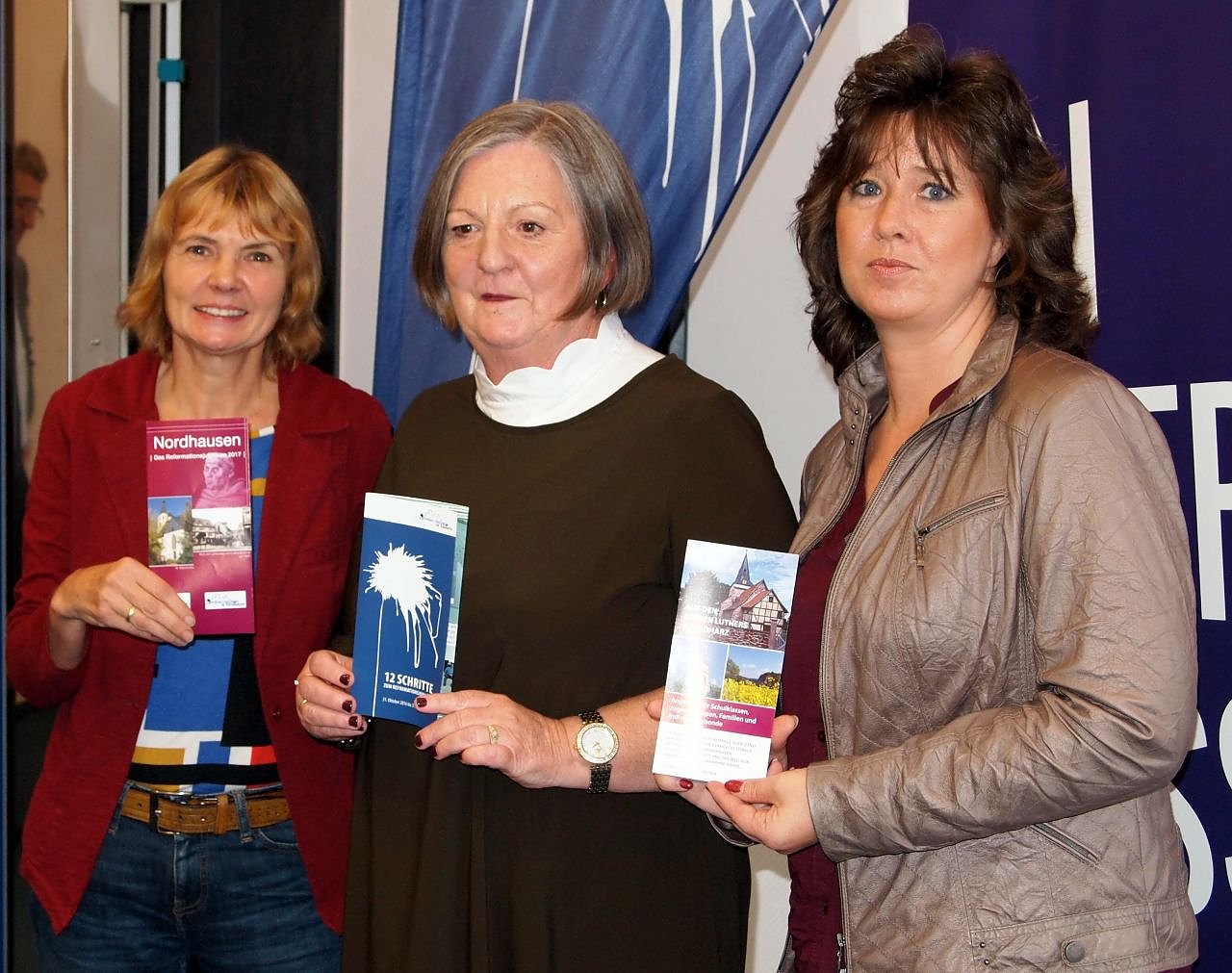 Drei Flyer in den Händen von B. Adam, P. Gunst & C. Witzel (Foto: R. Englert)
