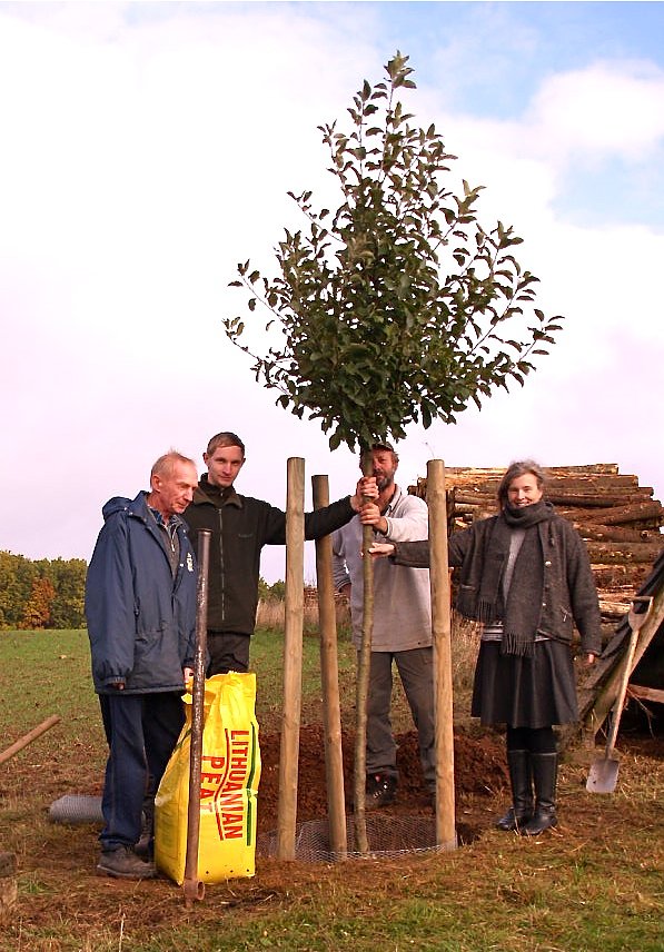 Anlässlich des Reformationstages hat die Kirchengemeinde Liebenrode in Steinsee auf dem Kummerberg ein Apfelbäumchen gepflanzt. Besonders Familie Aurin aus Steinsee hat sich dieses Projektes angenommen. Eine Goldrenette Freiherr von Berlepsch wurde angepflanzt, genannt nach dem Düsseldorfer Regierungspräsidenten Hans Hermann Freiherr von Berlepsch. Berlepsch vertrat übrigens 1891 die Auffassung, dass man den Arbeitern die Möglichkeit zu einer eigenverantwortlichen Mitwirkung am staatlichen und gesellschaftlichen Leben ermöglichen solle, im Gegensatz zum "Fürsorgemodell" des Sozialstaats bismarckscher Prägung. So ist meine persönliche Hoffnung für den gepflanzten Apfelbaum, dass sich die Bürger des Bäumchen annehmen, ihn schützen und die Pflege nicht der Regierung überlassen. Möge er so den müden Wandersmann Schatten spenden und mit einem seiner Äpfel stärken können.