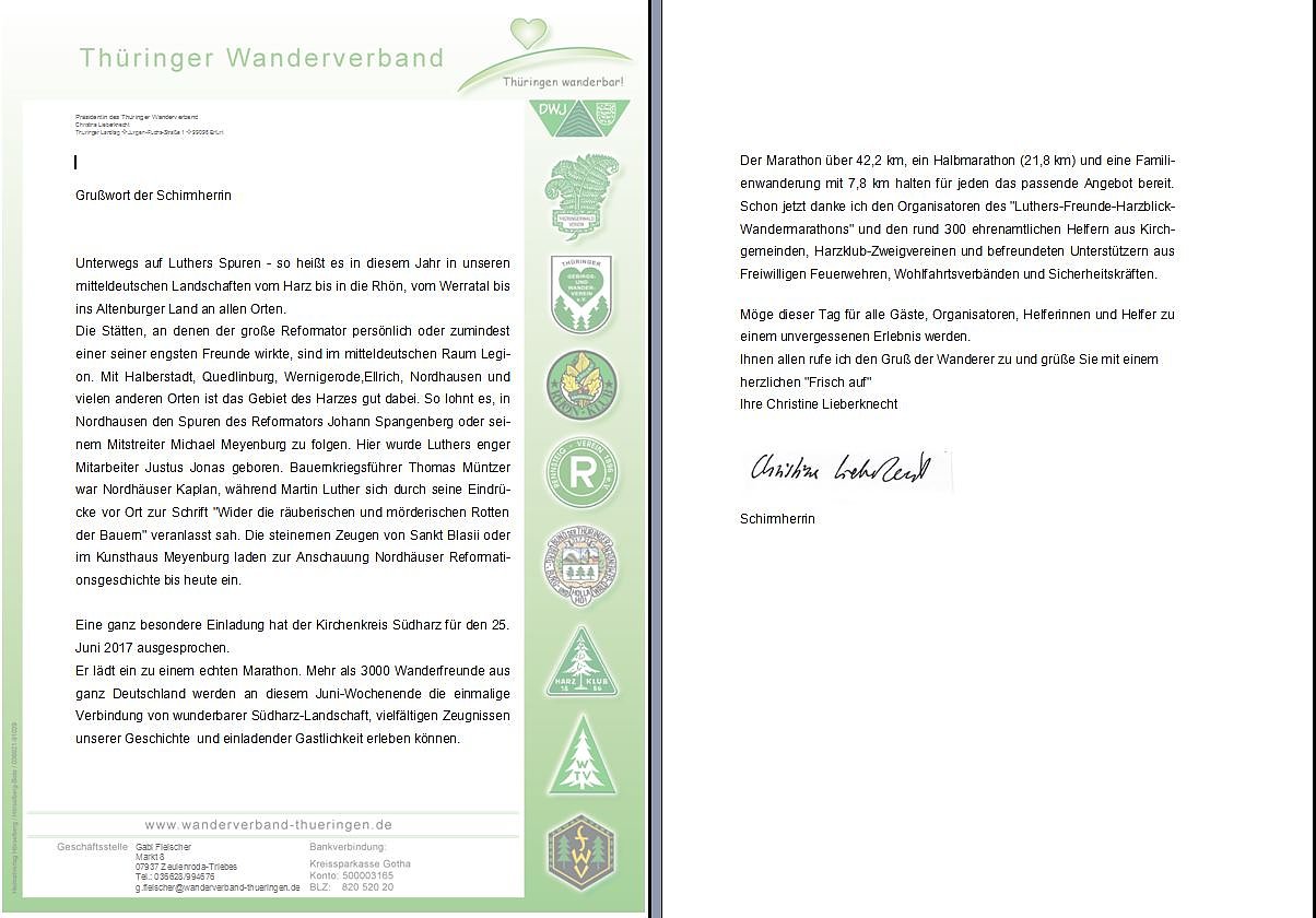 Der Marathon über 42,2 km, ein Halbmarathon (21,8 km) und eine Famili-enwanderung mit 7,8 km halten für jeden das passende Angebot bereit. Schon jetzt danke ich den Organisatoren des "Luthers-Freunde-Harzblick-Wandermarathons" und den rund 300 ehrenamtlichen Helfern aus Kirch-gemeinden, Harzklub-Zweigvereinen und befreundeten Unterstützern aus Freiwilligen Feuerwehren, Wohlfahrtsverbänden und Sicherheitskräften.