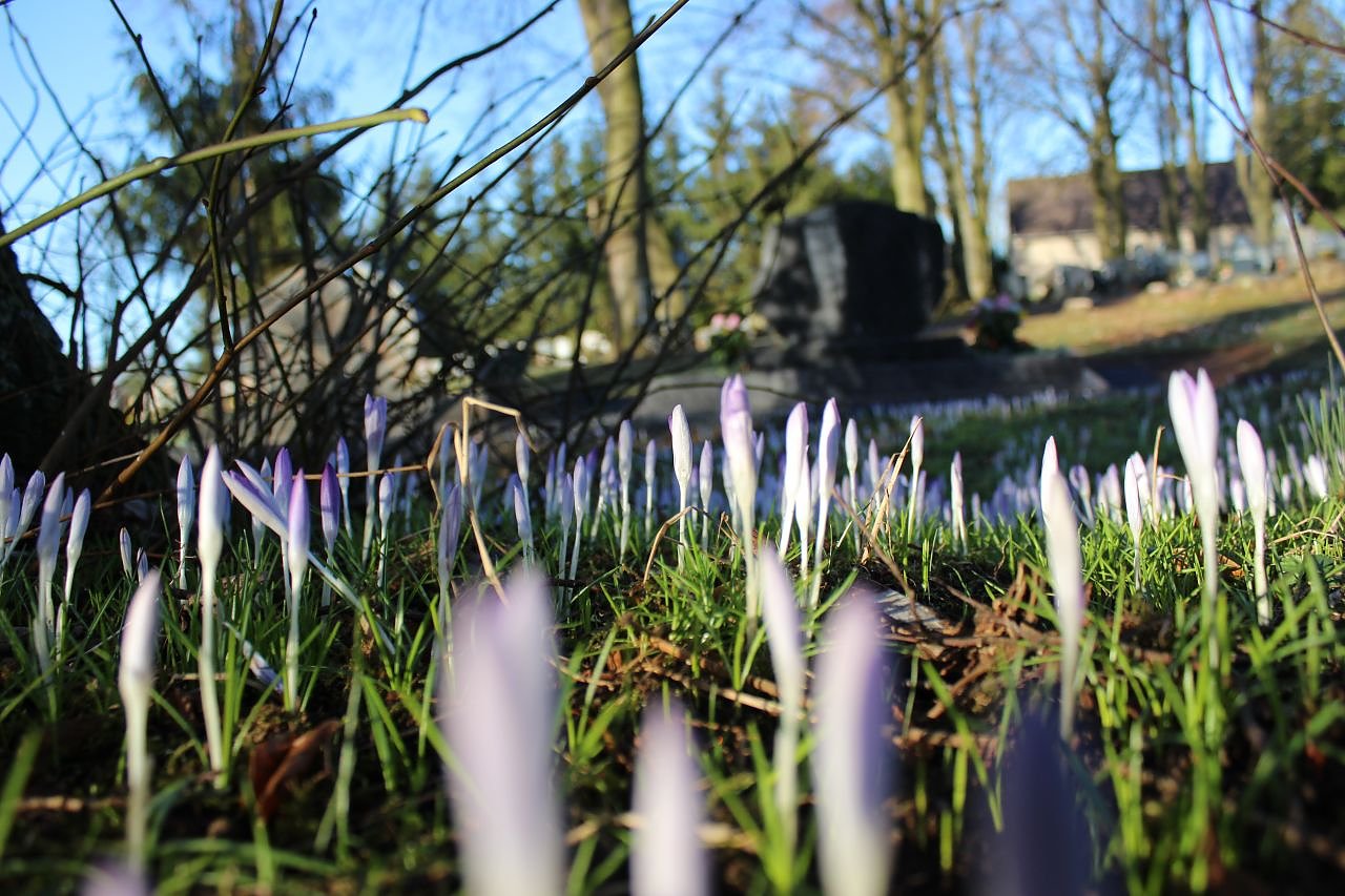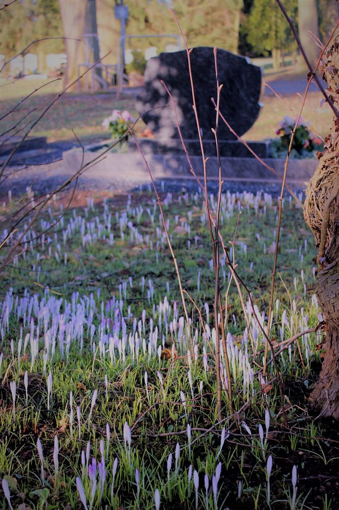 Eine kleine Entdeckung heute früh auf dem Friedhof in Großwechsungen. Ein Teppich voller Krokusse, irgendwann aus ihren Grabumrandungen ausgewandert, verzaubert in diesen Tagen einen ganzen Friedhof mit ihrer kleinen Osterbotschaft: Das Leben sucht sich seinen Weg aus den Gräbern.