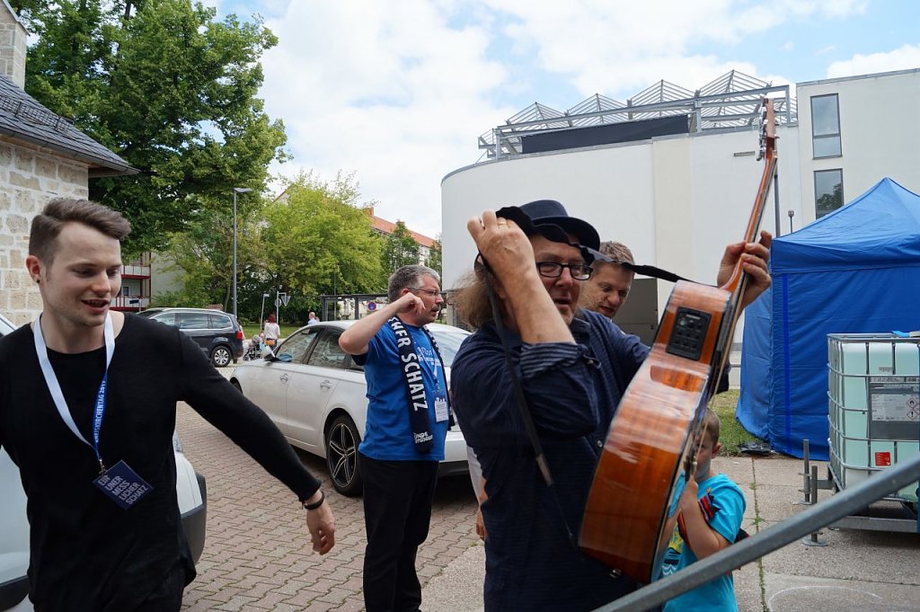 Der Liedermacher war am Sonntag gleich zweimal zu erleben. Einmal am Nachmittag mit einem Kinderkonzert auf dem Kreiskirchentag, zudem alle Kirchentagsbesucher herzlich eingeladen waren und diese Gelegenheit auch zahlreich nutzten. Und Gerhard Schöne scheute auch den direkten Kontakt nicht. Viele kleine Fans tobten vor der Bühne herum und wollten am liebsten auch gleich zu ihm. Gerhard Schöne blieb vollkommen entspannt und begeisterte sein Publikum. Spätestens als der "Popel" erklang, leuchteten die Augen seiner Zuhörer.