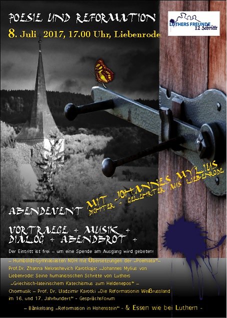 Mit dabei sind Frau Zhanna Nekrashevich-Karotkaja (hab. Dr. der Philologie, Professor des Lehrstuhls für die Geschichte der belarussischen Literatur, Belarussische Staatliche Universität). Sie referiert über Johannes Mylius von Liebenrode: Seine humanistischen Schritte von Luthers "Griechisch-lateinischem Katechismus" zum Heldenepos und Herr Uladzimir Karotki (Dr. der Philologie, Professor des Lehrstuhls für die Geschichte der belarussischen Literatur, Belarussische Staatliche Universität), der uns "Die Reformation in Weißrussland im 16. und 17. Jahrhundert" näherbringen wird. Natürlich wird es Möglichkeit zum Gespräch und für Nachfragen geben. Mit dabei ist der Kirchenchor Liebenrode, der musikalisch, kulinarisch und tänzerisch durch das Programm führen wird. Freuen Sie sich auf einen schönen Abend in mittelalterlicher Atmosphäre, Beginn 17.00 Uhr in und um die St. Petrikirche Liebenrode, mit Einblick in die Geschichte vor Ort! Im Hahnenhäuschen gibt es noch einmal die Möglichkeit, die Ausstellung alter Klassenfotos und eine Nachbildung der "Wartburg" zu besichtigen. Lateinschüler aus dem Humboldt-Gymnasium Nordhausen haben mit Hilfe ihres Lehrers Herrn Onnen Texte aus J. Mylius "Poemata" übersetzt, die in Liebenrode vorgetragen werden.