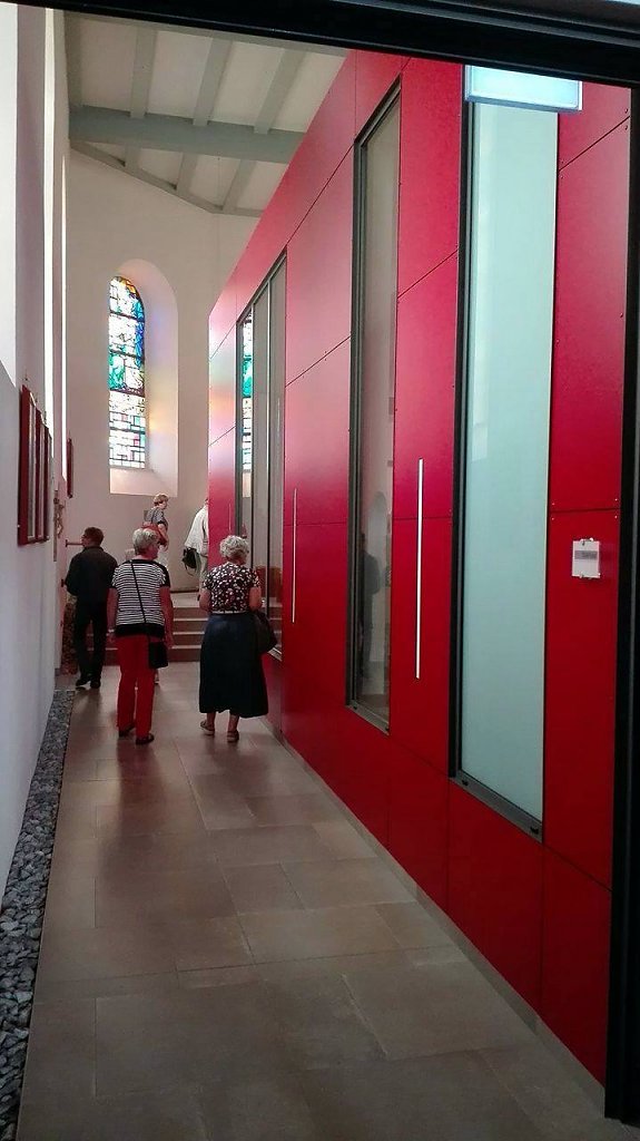Wir haben vieles mit ihm gemeinsam erlebt. In diesem Jahr fuhr uns der Bus zunächst Richtung Helmsdorf. An der dortigen Kirche St. Peter und Paul mit dem sehr schönen Garten, erwartete uns bereits die Küsterin. Wir bekamen einen Einblick in die Bau- und Kulturgeschichte des Gotteshauses. Im Innern des Bauwerks entdeckten wir Etwas für uns ganz Neues und Außergewöhnliches – eine Kirche in der Kirche. Ein modernes Gemeindezentrum wurde in die bestehende Kirche hineingebaut. Es bietet nun Raum für den Gottesdienst und alle erdenklichen Möglichkeiten zur Begegnung. Und auch wir durften hier gleich unsere Andacht abhalten. Pfarrerin Elisabeth Alpers-von Biela erzählte von schützenden Händen und ihre Bedeutung in unserem Leben. Gesungen wurde passend dazu: Nun nimm denn meine Hände….