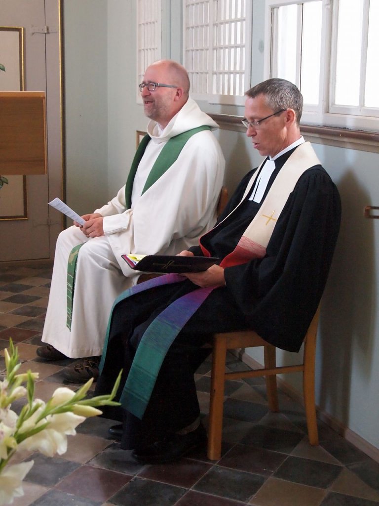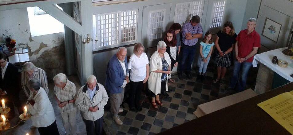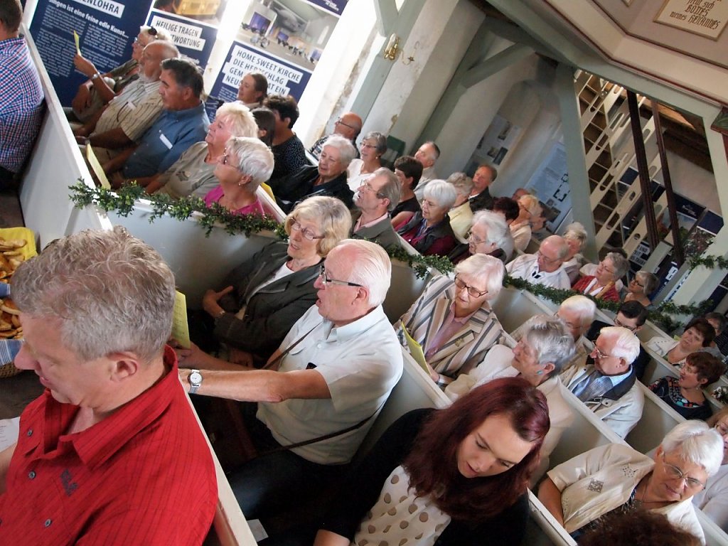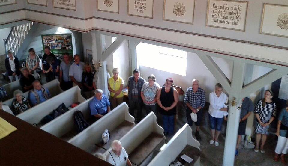 95 Gottesdienstbesucher hat ein fleißiger Teilnehmer gezählt. Sie kamen aus den der näheren Umgebung, aus dem Eichsfeld und sogar wirklich zu Fuß aus Ilfeld und Nordhausen. Morgens um 7 Uhr war die Pilgerin in Ilfeld gestartet. Respekt! Der fleißigste Radler war ein älterer katholischer Herr aus Kirchworbis, der sichtlich Freude an dieser bunten Vielfalt und der schönen Musik im Gottesdienst hatte. Gestaltet wurde der Festgottesdienst von Pfarrer Michael Blaszcyk aus Bleicherode, Pfarrer Bernhard Halver aus Niedergebra, dem Prädikanten Dr. Christoph Maletz aus Bleicherode, Kreiskantorin Margarita Yeromina, meiner Wenigkeit und von Sarah, die die Kollekte mit mir gemeinsam einsammelte. Beim Abendmahl erlebte Elende eine Premiere. Alle Teilnehmer versammelten sich im Kreis, auch rund um die Kirchenbänke, in der Kirche.