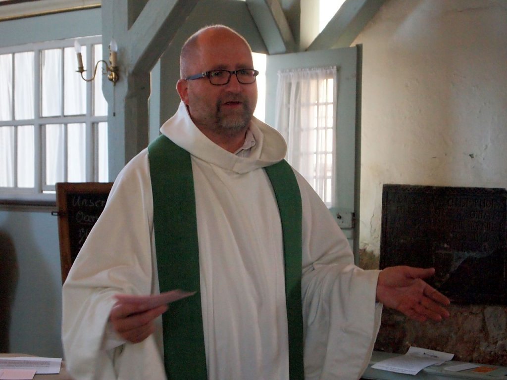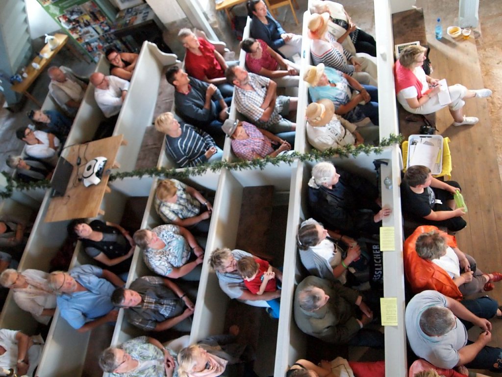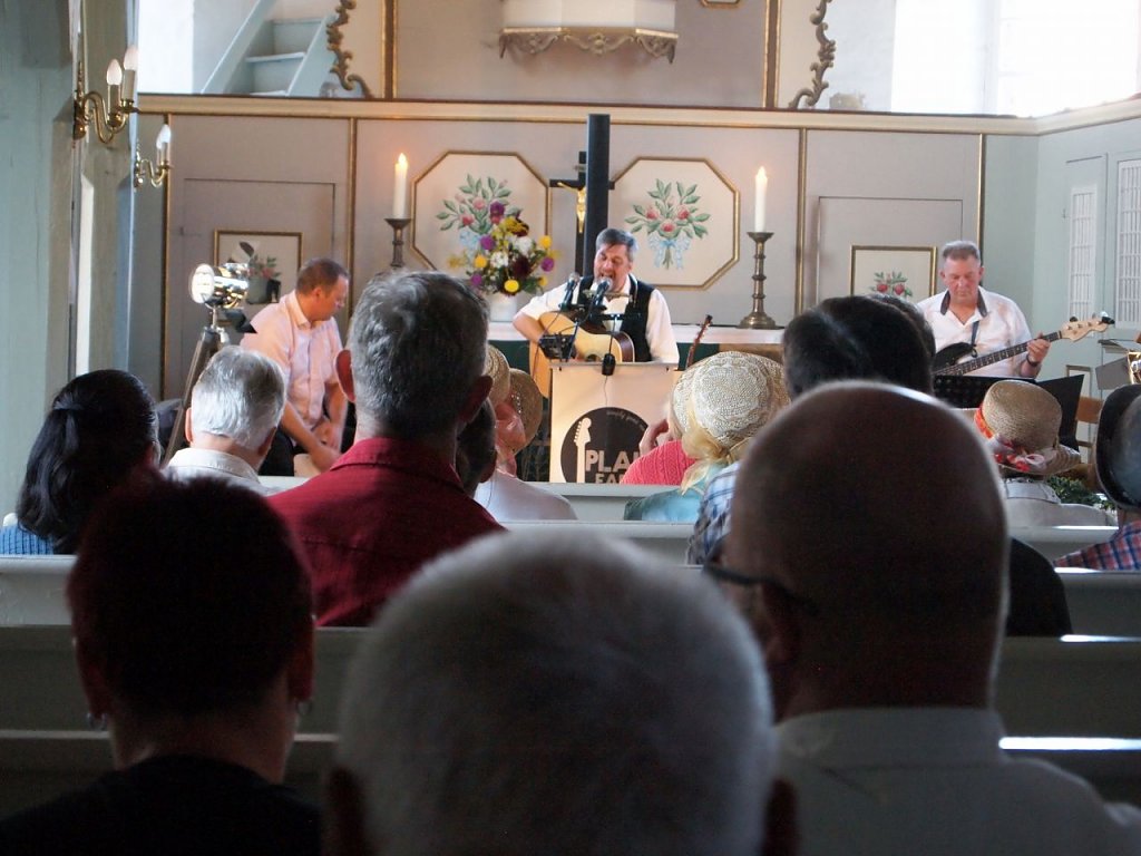 Kaum war die Leinwand nach dem Vortrag in der Kirche eingepackt, da baute auch bereits die Band auf. Neue Gäste kamen hinzu, die speziell gekommen waren, um Plain fare zu hören. Es ist schon ein besonderer Moment, wenn jemand, der ansonsten die Kirche in der Regel als Bestatter betritt, nun seine Gitarre auspackt und groovt. Mit Bassgitarre, Cajon und Mundharmonikas erschollen Country und Rock´n Roll in dem alten Gemäuer. Was für ein wunderbarer Abschluss für ein so gelungenes Fest.