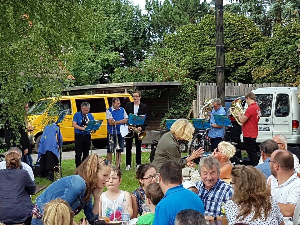 Im Anschluss erwartete die Gäste auf der Kirchwiese Herzhaftes und Erfrischungen vom Bürgerhof Bleicherode sowie in der Kirche ein großes hausgebackenes Kuchenbuffett mit duftendem Kaffee. Auf der Kirchwiese hatten sich zur Unterhaltung dann auch neun Bläser aus allen Richtungen unseres Kirchenkreises eingefunden, um zu musizieren. Da schmeckte das Mahl doch gleich noch einmal so gut. Kurz darauf ging es bereits weiter mit dem Vortrag von Martin Sladezcek zur Reformation in der Region. Sladezcek ist Doktorand der Geschichtswissenschaften an der Uni Jena und Reformationsbeauftragter des Kirchenkreises Arnstadt. Wir ließen es uns natürlich nicht nehmen, ihn nach dem Vortrag mit dem blauen Schirm des Kirchenkreises zu einem von Luthers Freunden im Südharz zu machen.