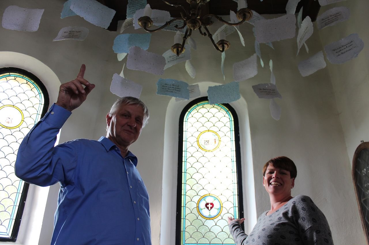 Der Aufbau des Lutherzimmers war eines der letzten großen Aufgaben des Vereins. Zur Einweihung am Samstag erwarten die Besucher dort unter anderem 95 Zitate von Martin Luther, auf handgeschöpftem Papier und als Windspiel gestaltet. Dies war eine Gemeinschaftsarbeit von Jugendsozialwerk und Kirchenbauverein. Auch ein Bildnis des großen Reformators und eine Vitrine mit Luther-Andenken ist zu sehen. Und natürlich auch die von Glasermeisterin Claudia Starke neu geschaffene Lutherrose im Fenster.