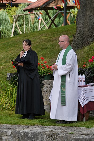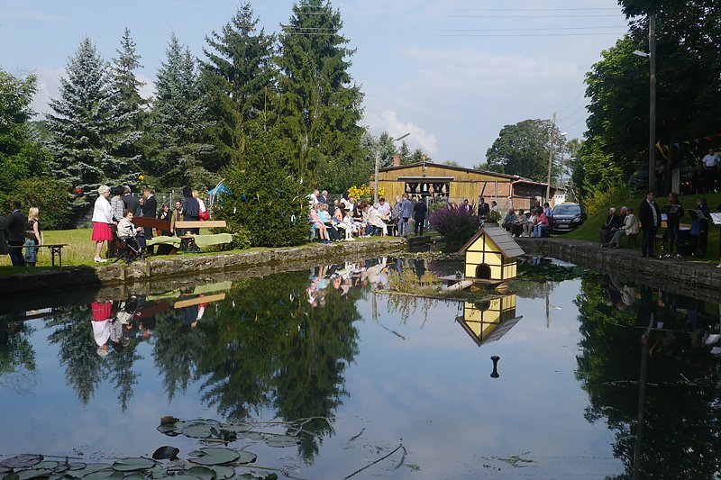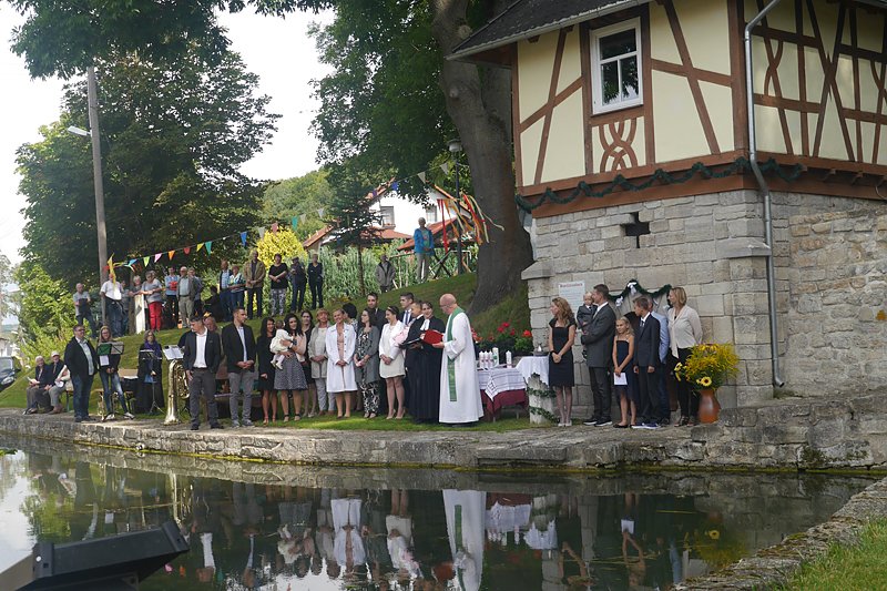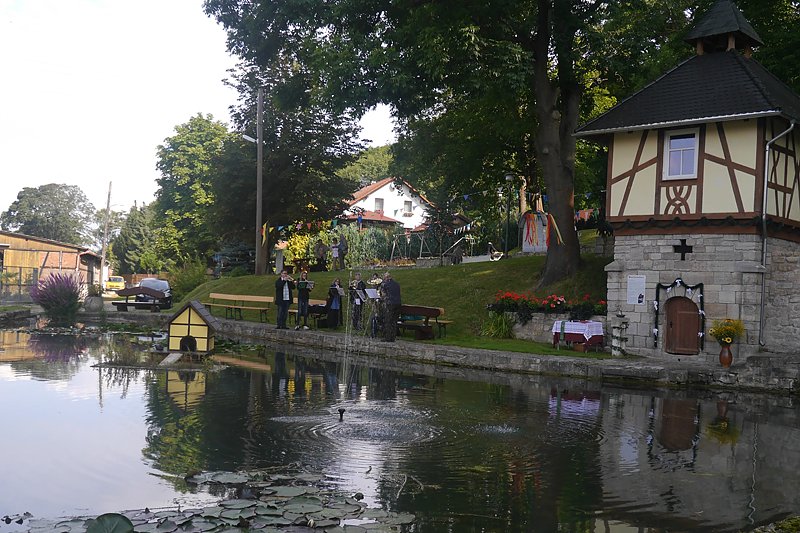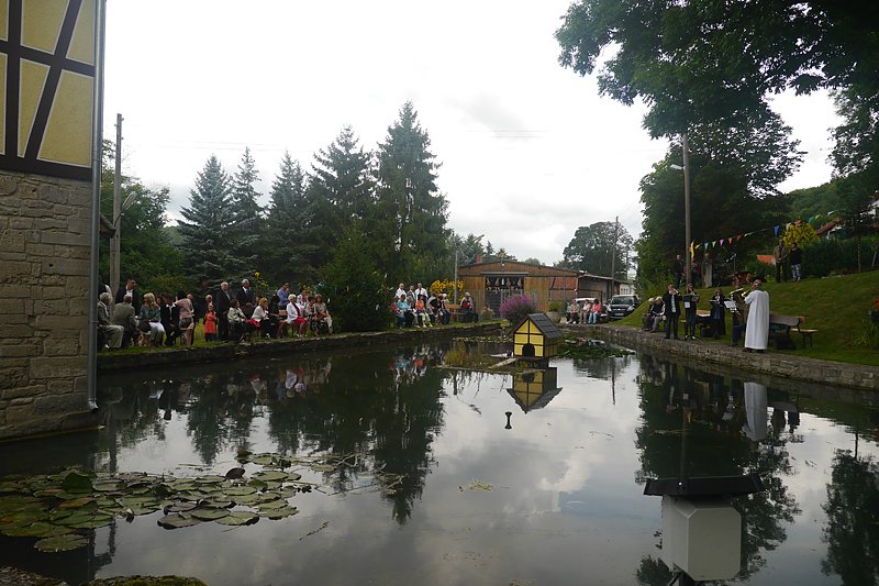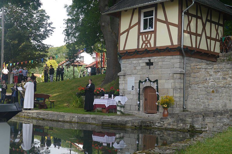 Am 2. September fand in Dietenborn das Klosterfest statt. Auftakt war der Taufgottesdienst am Bonifatiusborn. Drei Familien hatten sich entschieden hier ihre Kinder taufen zu lassen. Sie kamen aus Großberndten, Großenehrich und Immenrode. Die Klänge eines kleinen Posaunenchores stimmten die Besucher schon lange vor Beginn auf den Gottesdienst ein. Rund um den Klosterteich warn Bänke aufgestellt, doch die Plätze reichten nicht aus. So suchten sich viele noch gute Stehplätze, damit sie mit den Tauf-Familien diesen besonderen Tag feiern konnten. Pfarrer Halver aus Niedergebra, zu dessen Pfarramtsbereich Dietenborn gehört und Pfarrerin Neuland aus Holzthaleben (Kirchenkreis Bad Frankenhausen-Sondershausen) gestalteten diesen sehr guten Gottesdienst unter freiem Himmel. Nach dem Psalm 91 der gemeinsam gesprochen wurde erzählte in der Predigt Pfarrer Halver vom Wassertropfen, der den Himmel kennen lernte. Der Himmel beim Gottesdienst war sonnig, mit etwas Bewölkung und hielt seine Wassertropfen bis zu den letzten Posaunenklängen zurück.