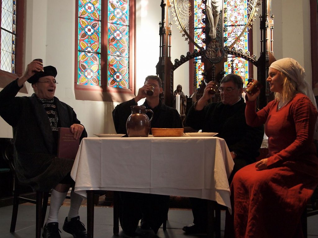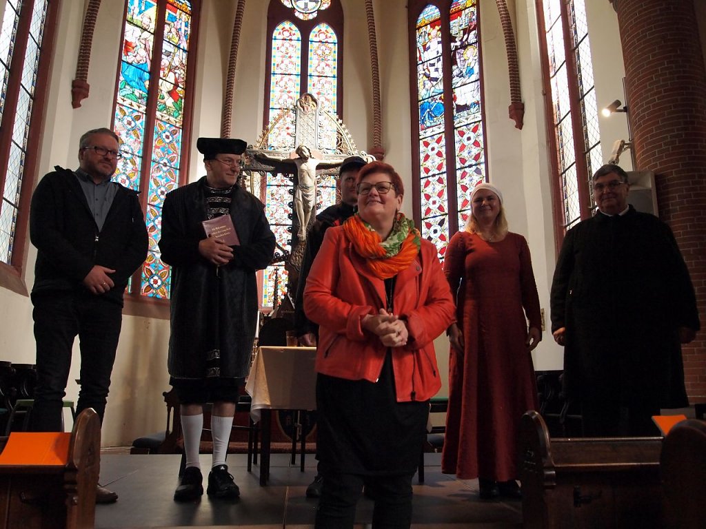 Ehepaar Heike und Carsten Stenger gaben die Katharina Luther und den Melanchthon, wobei er zudem noch in die Rolle einer modernen Person schlüpfen musste. Bürgermeister Klante, der ursprünglich eine Rolle hat übernehmen wollen, war wegen Krankheit leider kurzfristig ausgefallen. Den Luther gab Oberförster i.R. Arndt Petsch und als zweiter moderner Mensch war Sebastian Gerecke zu sehen.