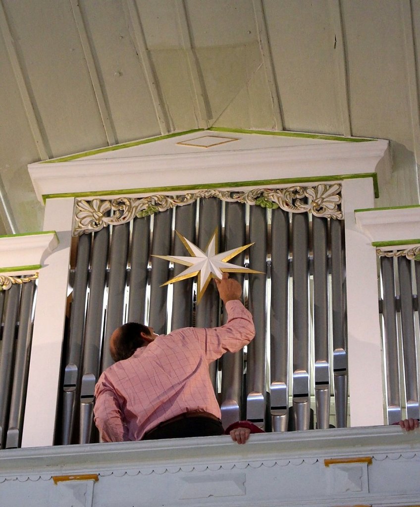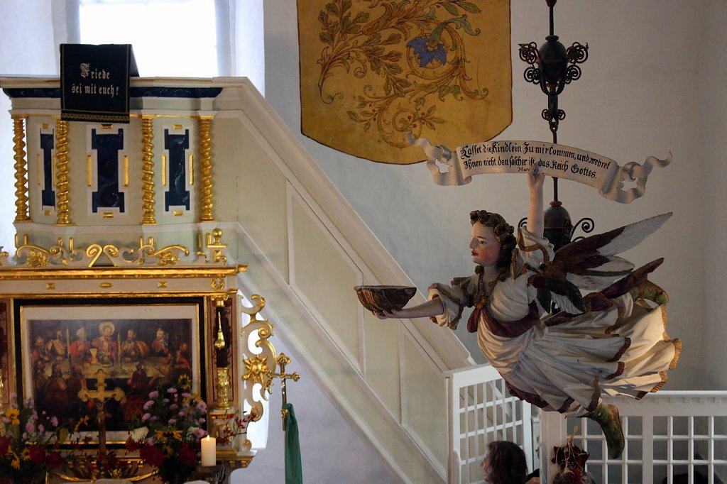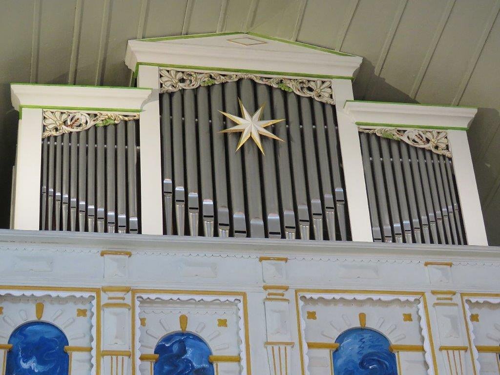 Und so konnte die Firma Hüfken, die für ihren sorgsamen Umgang mit historischen Instrumenten einen guten Ruf hat, die Gottlieb Knauf-Orgel von 1868 wiederherstellen. Mit ihren 10 Registern und der Pedalkoppel bringt sie die Kirche mit ihrer ausgezeichneten Akustik zum Tönen. Und nun hat auch sie noch etwas ganz Individuelles. Ein Cymbelstern kann zukünftig die Sommervögel oder den Engelsgesang direkt in die Kirche holen.