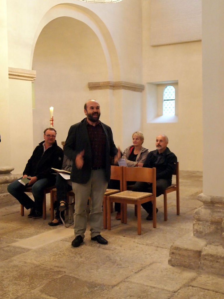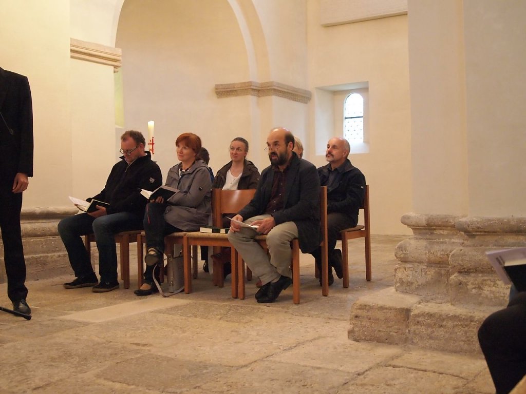 Unter der Leitung des Komponisten und Chorleiters Paul Heller aus Leipzig tauchten die Gäste ab 14 Uhr in der Basilika Münchenlohra in die Welt des Lutherchorals und der freitaglichen Vesper des Thomanerchores Leipzig ein. Rund 20 interessierte SängerInnen hatten sich dazu eingefunden. "Es waren alles gute Sänger und die Probe hat sehr viel Freude bereitet", klang es unisono von den Ensemblemitgliedern. Einiges an Liedgut wurde mit Paul Heller in der doch kühlen Basilika eingeübt. Hinterher trank man in gemütlicher Runde in der warmen Klosterstube Kaffee und genoss viel köstliches Selbstgebackenes.