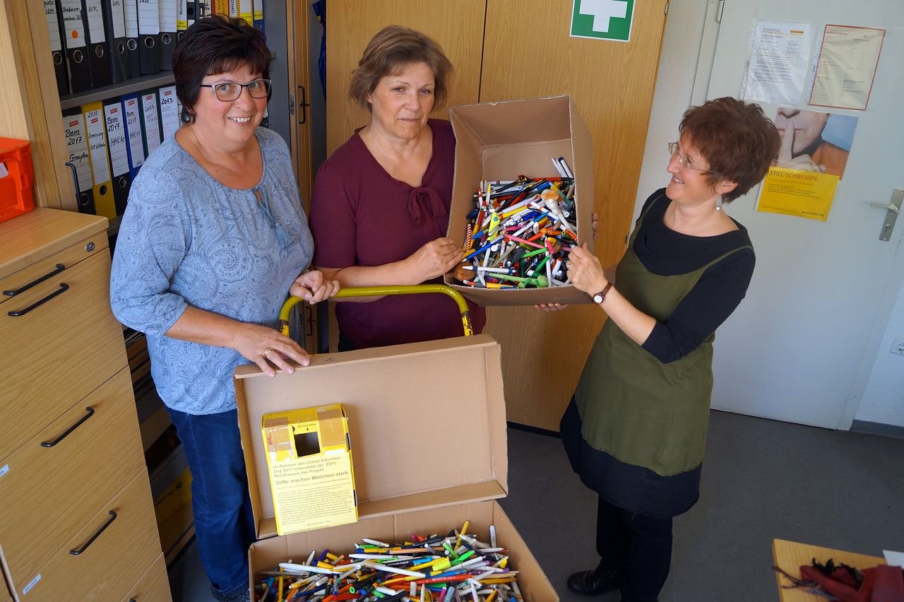 Was für ein tolles Ergebnis - Mitte Oktober wurden im Südharz die ersten 30 kg leere Stifte von der Post Nordhausen übergeben. Und dabei ist es keine zwei Monate her, dass Kathrin Schwarze, die stellvertretende Delegierte unserer Landeskirche (EKM) beim Weltgebetstagskomitee, auf die neueste Aktion des WGT aufmerksam machte. Stifte machen Mädchen stark, so heißt das Projekt. Sein Ziel ist es, mit jeweils 450 leeren gesammelten Stiften ein syrisches Mädchen in einem libanesischen Flüchtlingscamp mit Schulmaterial zu versorgen. Im Südharz gingen schnell Pressemitteilungen raus, Gemeinden wurden informiert, ein Radiointerview gegeben, ein Info-Button auf die Homepage des Kirchenkreises gestellt. All dies blieb nicht ohne Wirkung. Seither haben sich viele Organisationen in der Region bereiterklärt mitzumachen.