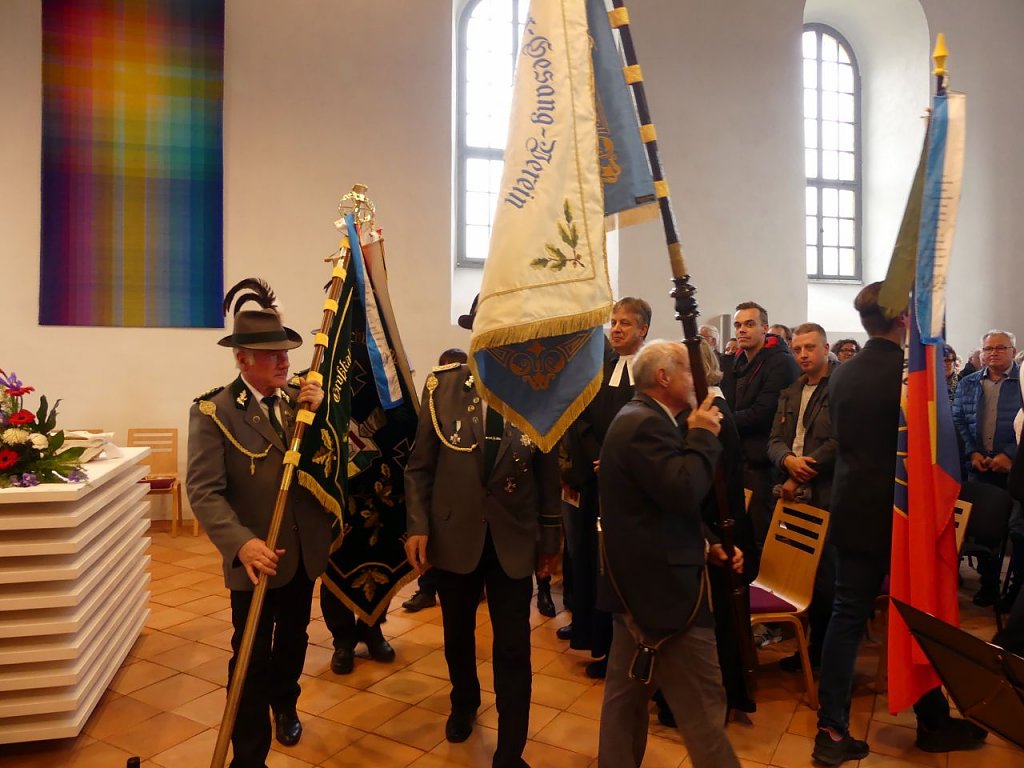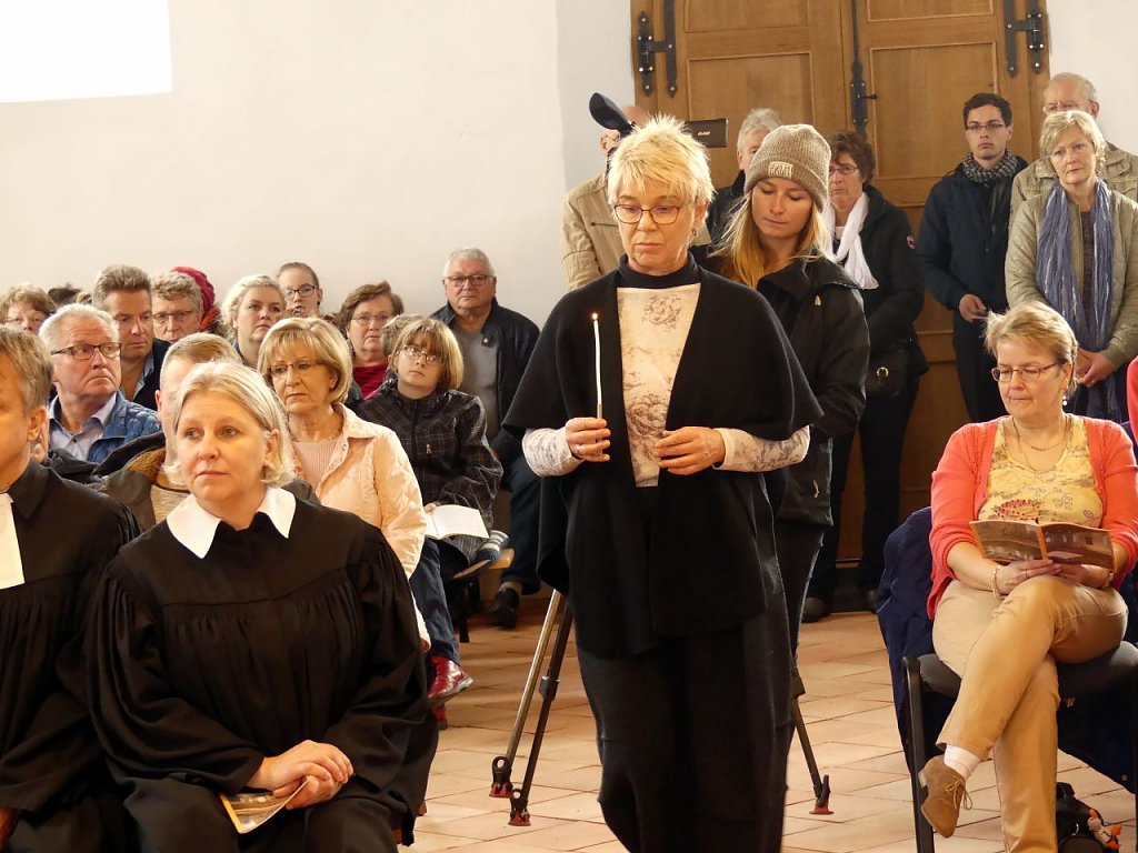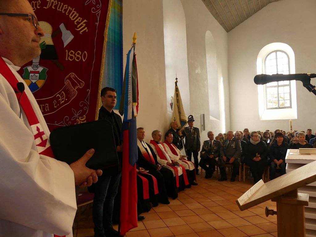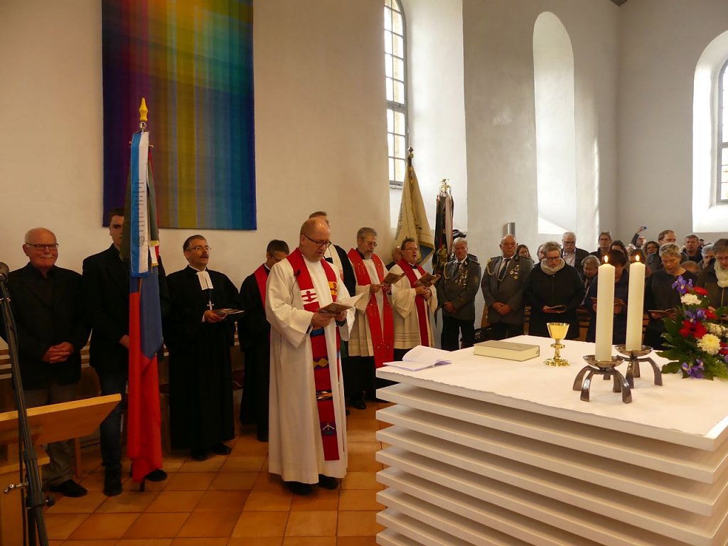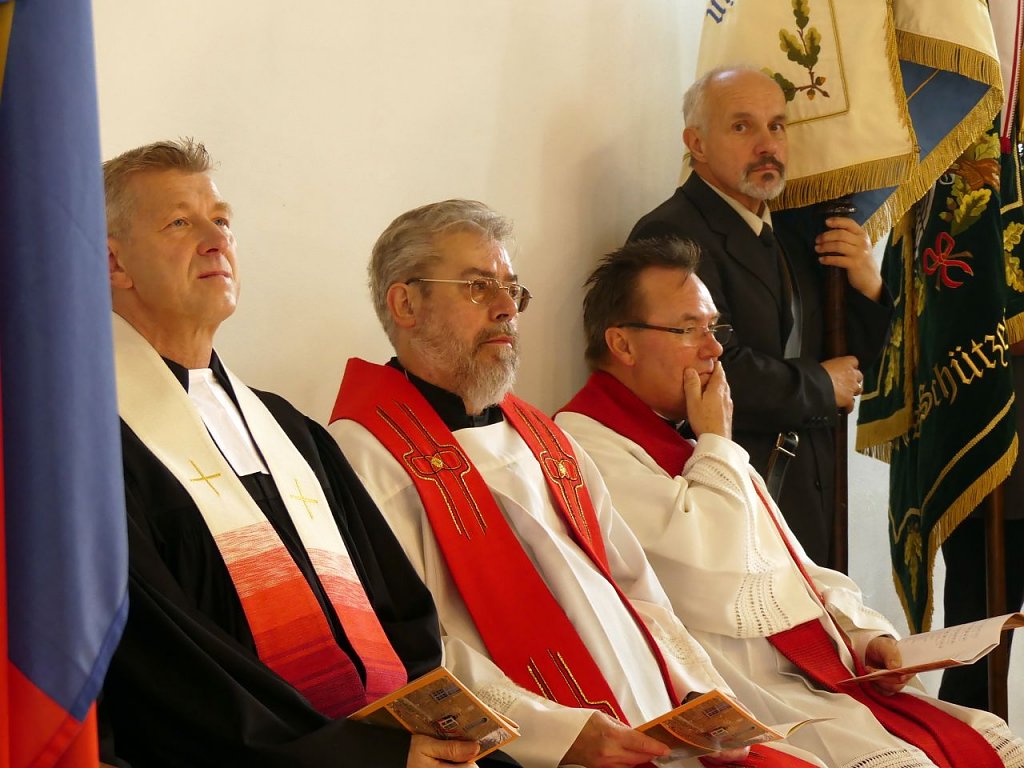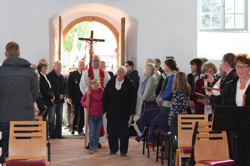 Der Gottesdienst begann mit dem festlichen Einzug - Pfarrer Halver klopfte von außen an die Tür und bat die Pforte zu öffnen. Als dies geschah, ging Helena Herzel mit dem Vortragekreuz voran, hinter ihr Pfarrer Bernhard Halver, dann die Vereine, teils mit Fahnen, gefolgt von der Bürgermeisterin Burgunde Krumm, dem Gemeindekirchenrat, wobei mit ihnen die Bibel und der Kelch wieder Einzug hielten, den Pfarrern der Umgebung, unter ihnen die katholischen Pfarrer Hentrich und Seideneck. Und als Letzter zog traditionell Superintendent Andreas Schwarze ein. Derweil spielte Michael Kremzow bereits auf der neuen-alten englischen Orgel.