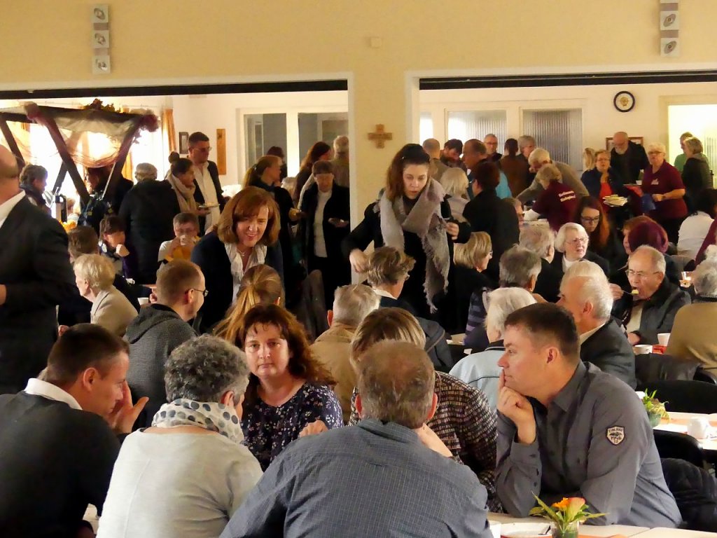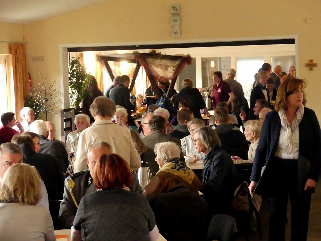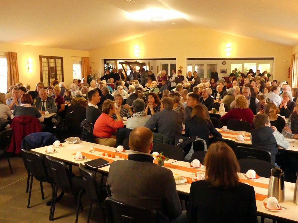 Nach dem Gottesdienst zog die Festgemeinde in das örtliche Dorfgemeinschaftshaus zu Kaffee & Kuchen und ein paar Dankesworten. 33 Kuchen und Torten standen bereit, ebenso wie die Mitglieder des Fördervereins St. Nicolai, die ständig mit neuem Kaffee und Gedecken unterwegs waren.