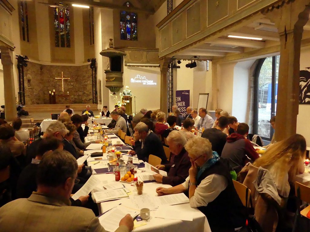 Gut 40 Synodale versammelten sich am Samstag in den neuen Räumen der Herzschlag-Jugendkirche zur Herbstsynode des Kirchenkreises Südharz. Bereits vor dem Gottesdienst, den das erst vor kurzem im Kirchenkreis angekommene Pfarrehepaar Sabine und Hauke Meinhold gestaltete, schauten sich alle neugierig um. Wie gut, dass Jugendliche in der Mittagspause durch ihr neues Zuhause führten – da gab es für die Synodalen viel zu entdecken. Das Engagement der Jugendlichen als Gastgeber war übrigens einfach nur großartig, das muss deutlich gesagt werden. Alles war für die Synode vorbereitet worden, von Tischen und Stühlen über die Verpflegung bis zur Technik und dem Service beim Mittagessen. So nahmen auch die Synodalen das neue Zuhause mit Leichtigkeit im wahrsten Sinne des Wortes in Besitz.