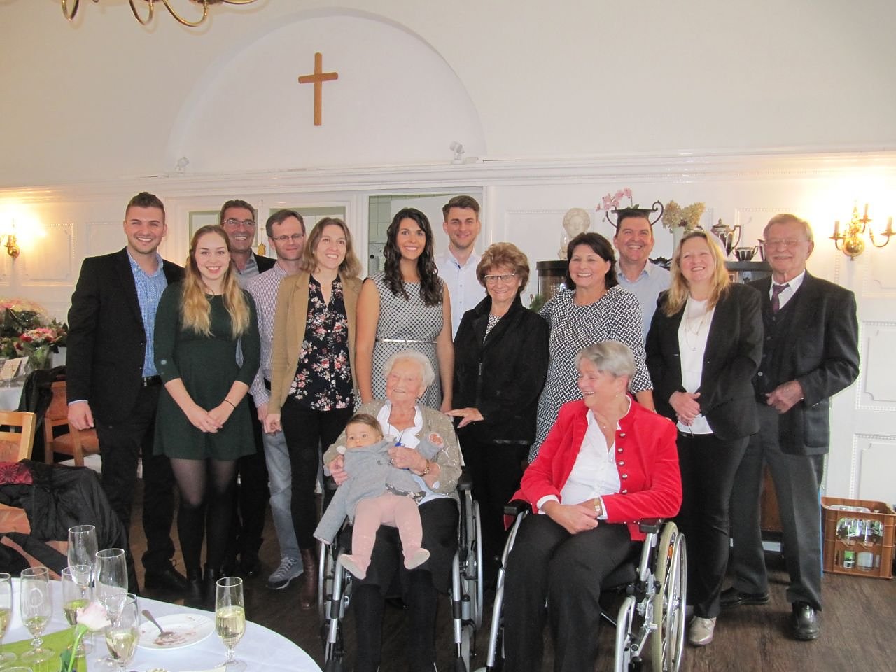 Am 11. November 2017 gab es nun ein großes Ereignis zu feiern. Die lebensbejahende und liebenswerte Dame beging ihren 100. Geburtstag. Die Familie, die mittlerweile fünf Generationen umfasst, hatte im Saal der Hermann-Arnold-Stiftung eine Feier organisiert. Viele Menschen kamen, um Frau Reinert zu diesem Jubiläum zu gratulieren und mit ihr anzustoßen. Ihre Ur-Ur-Enkeltochter Hannah war an diesem Tag der große Sonnenschein. Gefreut hat sich Frau Reinert auch über den sehr ausgiebigen Besuch von unserem Oberbürgermeister Herrn Buchmann und dem Landrat Matthias Jendricke.