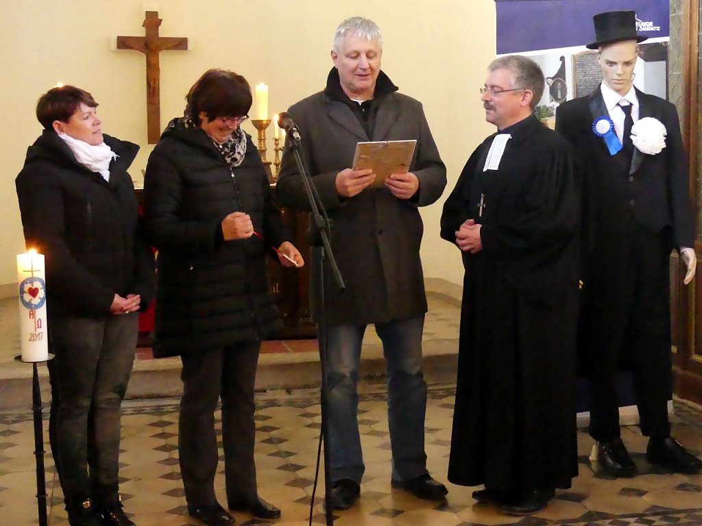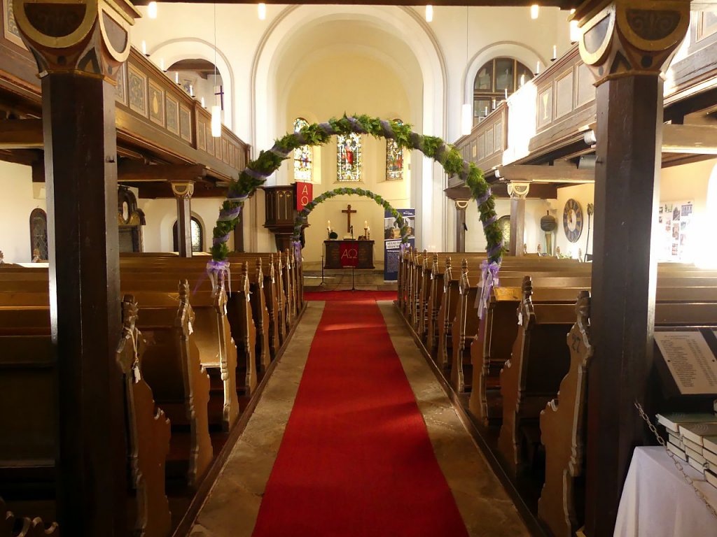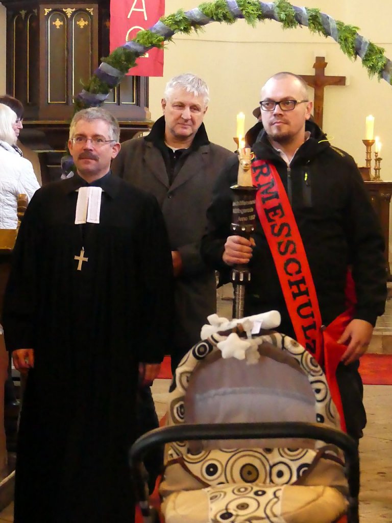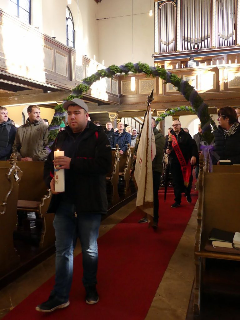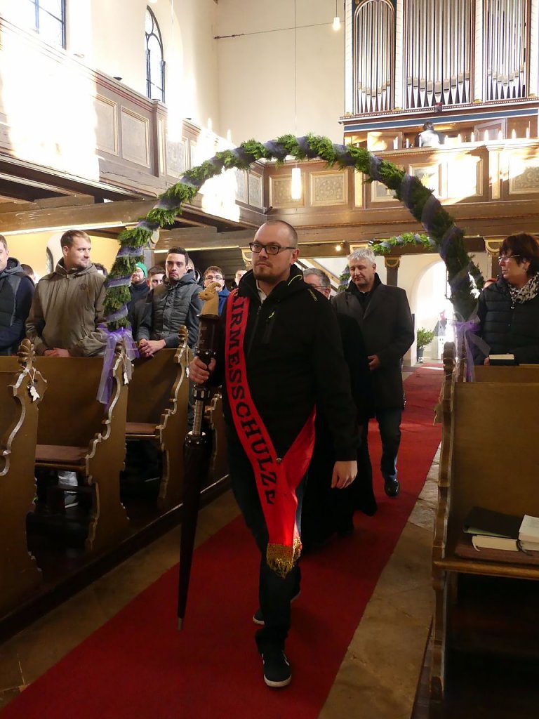 Und so war alles hübsch hergerichtet, als der Superintendent, der Vikar, der alte und der neue Kirmesschulze sowie Stephan Domann vom Gemeindekirchenrat in das Gotteshaus einzogen. Mit ihnen die Fahne der Kirmesburschen.