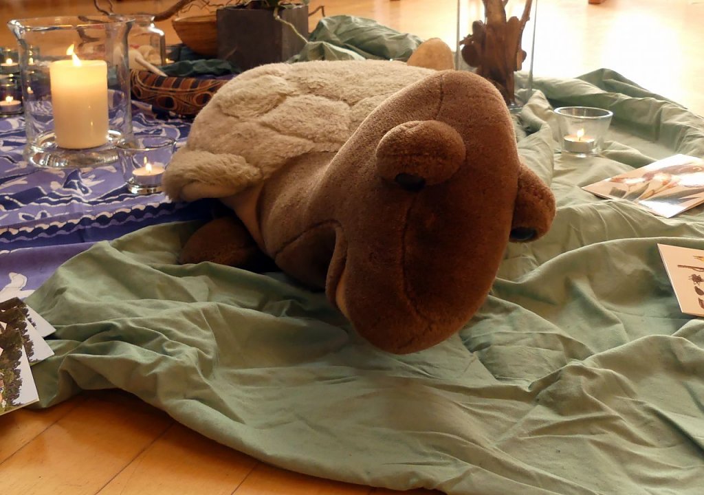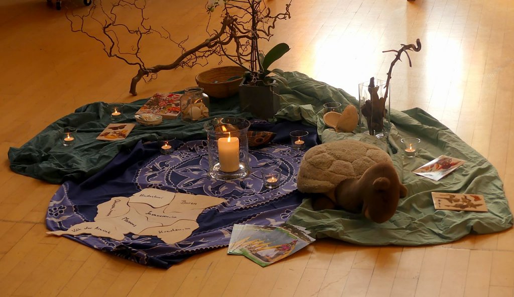 Das Frauenteam unseres Kirchenkreises hatte alles wunderbar vorbereitet. Die gestaltete Mitte - samt großer Plüsch-Schildkröte,einem Länderpuzzle und schönen Bildern - begrüßte uns gleich beim Hereinkommen.