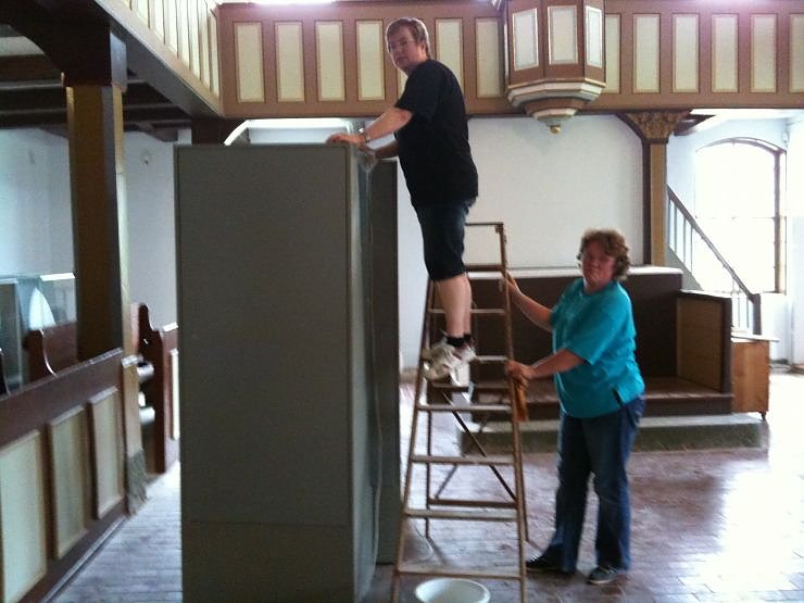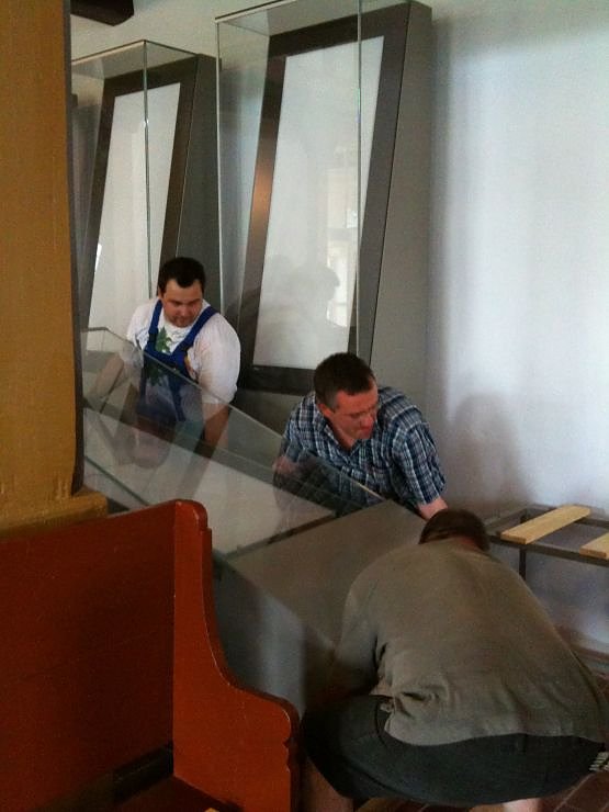 Solche erfreute Aussagen waren am Freitagnachmittag oft zu hören. Alle Wände des Kirchenschiffes sind inzwischen durch den Malermeister Hosbach aus Weißenborn neu gemalert worden. Außerdem konnte am Freitagnachmittag, die vier Stehvitrinen mit Hilfe der Firma Schindewolf aus Stöckey aufgestellt werden, so dass heute die ersten vier Glasmalereien aus Freiberg zurückkehren können.