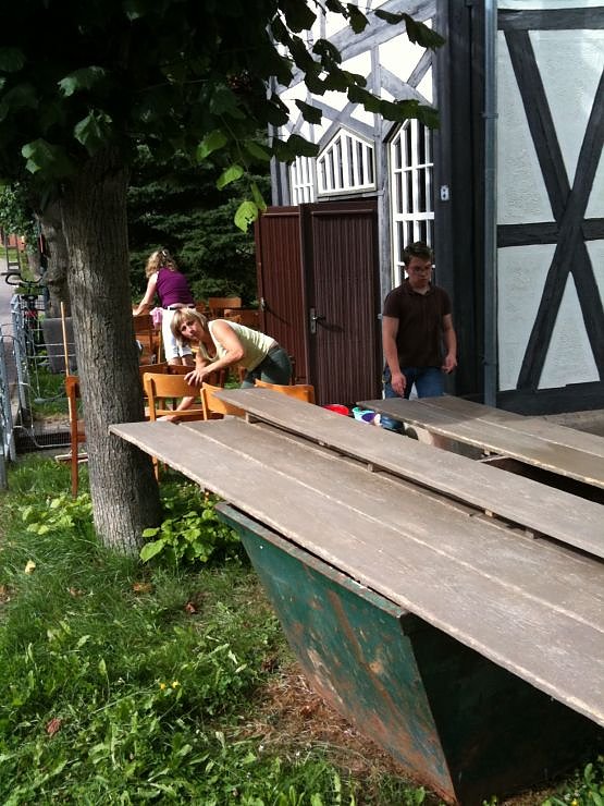 viele Silkeröder Frauen putzen die Kirche, damit zum Borngrundfest am 16. August um 14 Uhr der erste Gottesdienst seit einem halben Jahr gefeiert werden kann. Davor werden am 16. August ab 13 Uhr das erste Mal alle sechs Silkeröder Glasmalereien der Öffentlichkeit präsentiert.
