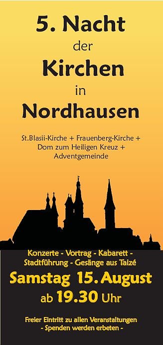 Am Abend und in der Nacht von Samstag auf Sonntag stehen die Türen aller Nordhäuser Kirchen weit geöffnet. Bevor die einzelnen Kirchen und Gemeinden mit unterschiedlichsten Angeboten und Programmen beginnen, startet um 19.30 Uhr am Petersberg-Turm erstmalig eine "musikalische Stadtführung" Unter dem Motto: "Hören-Entdecken-Erinnern" wird es an geschichtsträchtigen ehemaligen Kirchenstandorten der Stadt pikante musikalische Impressionen - verbunden mit stadtgeschichtlichen (Neu-) Entdeckungen geben. Unter sachkundiger Leitung führt der (etwa 1-stündige) Rundgang vom Petersberg-Turm zur ehemaligen Nikolai-Kirche hinter dem Rathaus, über den "Spendekirchhof" in der Altstadt bis zum ehemaligen Standort der St. Jacob-Kirche. Am Ende des Rundganges lädt eine kleine kulinarische Stärkung zu Weiterem ein.