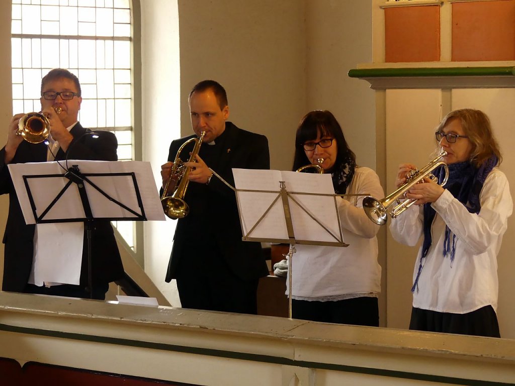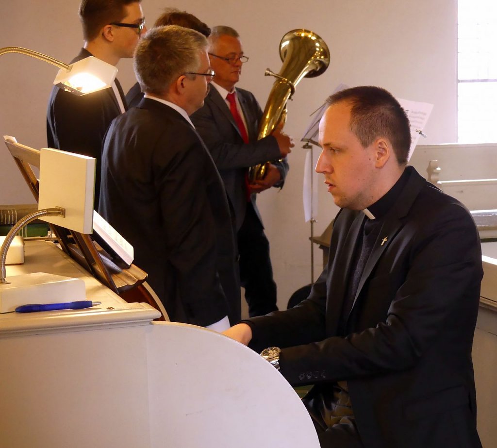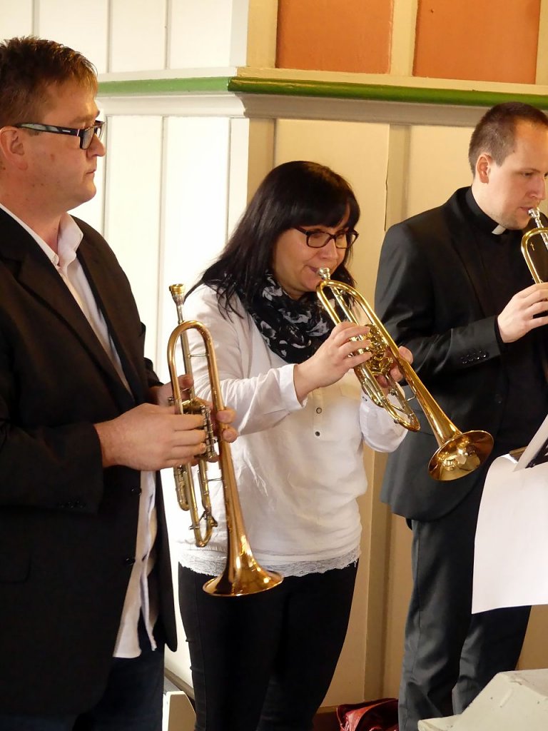 Österliche Choräle erklangen im Gottesdienst von der Empore. Acht Musiker aus unserem Kirchenkreis hatten sich dort mit ihren Notenständern und Instrumenten aufgebaut. Unter ihnen auch der Superintendent Andreas Schwarze und Präses Dr. Uwe Krieger. Zudem André Johne, der Kreisposaunenwart, Andreas und Stephanie Rumpf aus Wipperdorf, Frau Hesse aus Niedergebra sowie Niklas Grimm aus Bleicherode. Und der Herr Vikar sprang fröhlich zwischen Posaunenchor, Orgel und Altar hin und her.