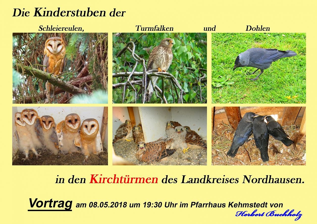 "In Kehmstedt leben schon seit etlichen Jahren sehr erfolgreich einige Vögel im Kirchturm - betreut von den Vogelfreunden, die ja überall im Kirchenkreis aktiv sind. Von Dez 17 bis März 18 wurden die Nistkästen erheblich erweitert, der Kehmstedter Kirchturm ist jetzt geradezu ein Vogel-Hochhaus. Daraus hat sich die Idee entwickelt, einmal einen Gemeindeabend zu veranstalten, um die verschiedenen Bewohner genauer vorzustellen. Dieser soll am Dienstag, dem 8. Mai, um 19.30 Uhr im Kehmstedter Gemeindehaus (ehem. Pfarrhaus) stattfinden."