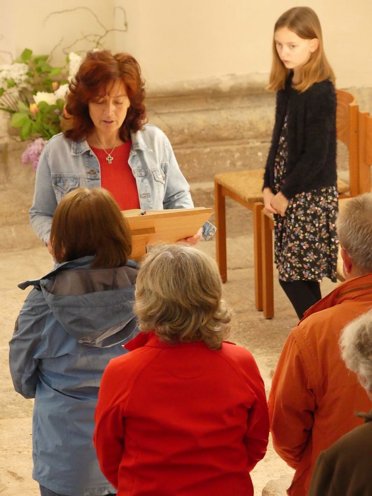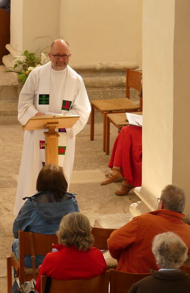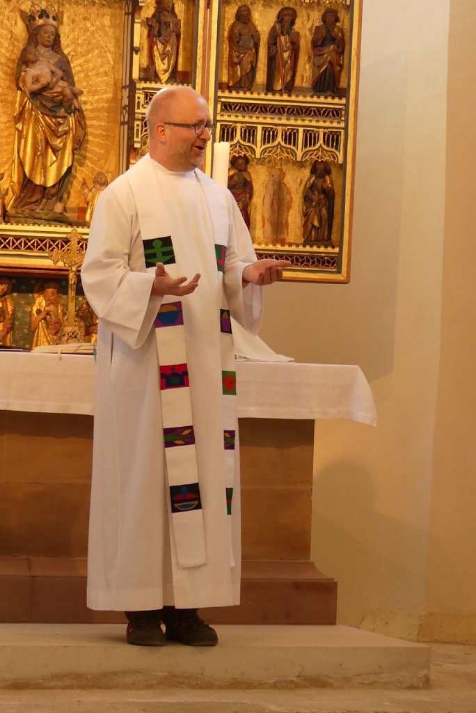 Denn vor dem Picknick ziehen Pfarrer Michael Blaszcyk und Pfarrer Bernhard Halver mit der Schola und dem Vortragekreuz in die Kirche ein. Die Gottesdienstgemeinde ist versammelt. Viele Bläser aus der Region warten bereits oben auf der Empore auf ihren Einsatz und Norbert Patzelt spielt die Orgel. Derweil lacht die Sonne freundlich durch die Kirchenfenster und lässt die Basilika wie von innen heraus leuchten. In diesem Jahr war eine etwas andere Predigt zu hören, Pfarrer Blaszcyk hatte eine Meditation im Wechselgespräch mit Diana Wand vorbereitet. Und wie sollte es anders sein, war der Himmel das allumfassende Thema.