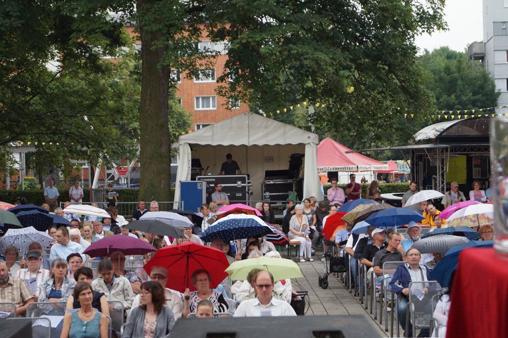 Der langersehnte sanfte und warme Regen hielt weder Jung noch Alt vom Gottesdienst ab. Ein buntes Meer an Regenschirmen schenkte kleine trockene Freiräume und tat dem Kirchentagsflair keinen Abbruch.