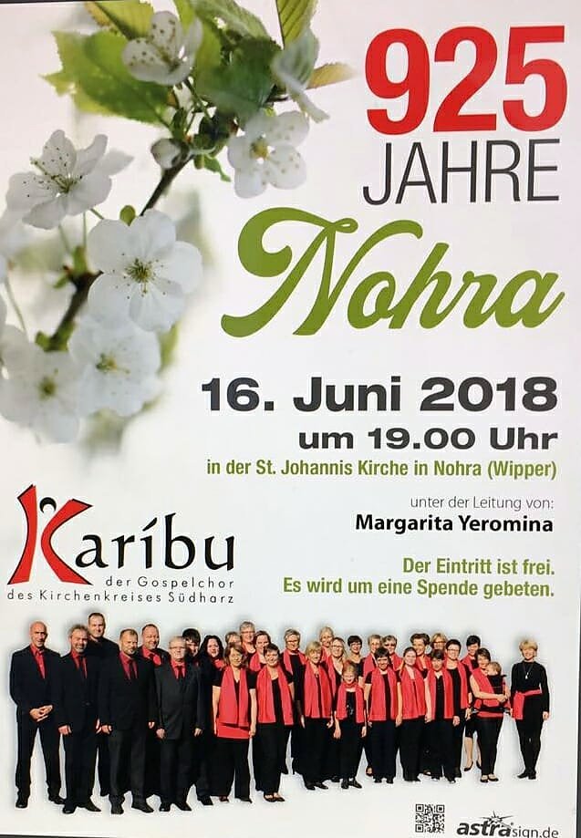 Diesen Samstag singt der Gospelchor Karíbu unter der Leitung von Margarita Yeromina in der Kirche in Nohra zum Start der Festwoche – 925 Jahre Ersterwähnung Nohra. Mitsingen und -swingen ist ab 19.00 Uhr möglich. Der Eintritt ist frei, um eine Spende für den Erhalt der Kirche wird herzlich gebeten.