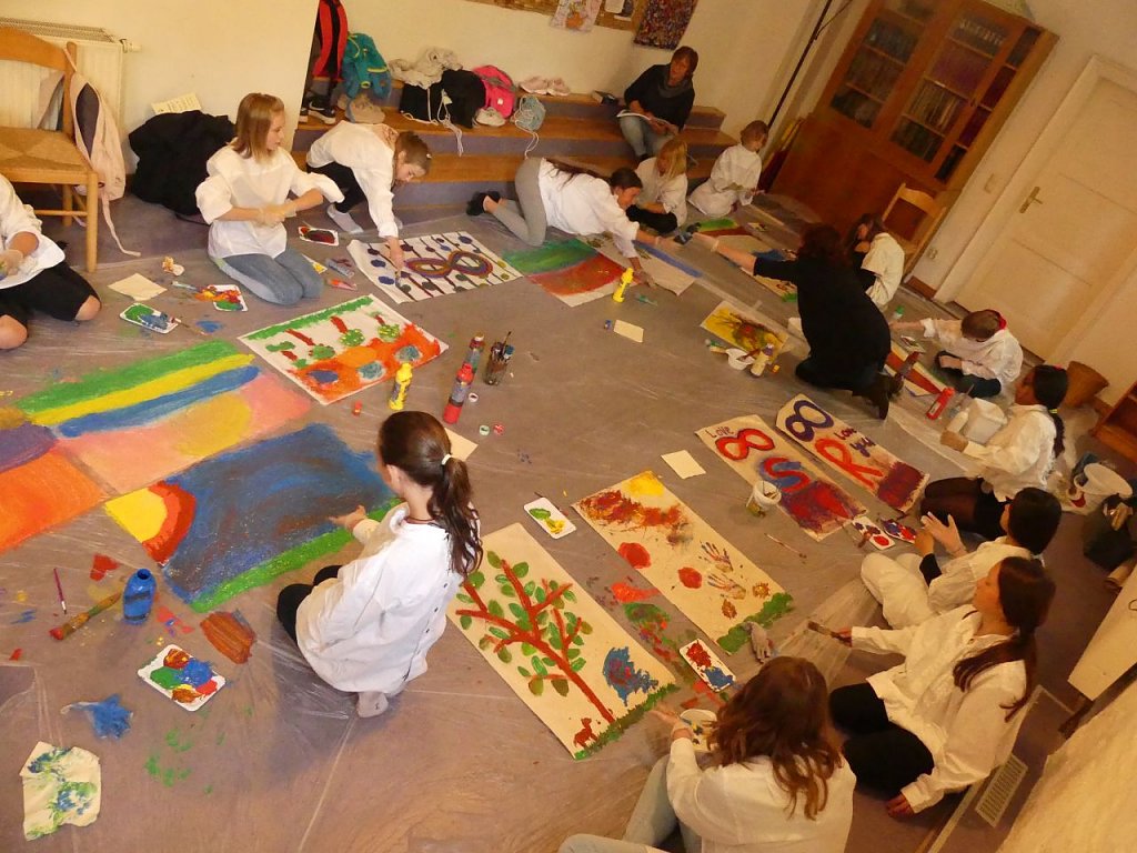 Gemeindepädagogin Sophie Knappe von der Jugendkirche spielte gleich zu Beginn ein Lied auf der Gitarre, das immer mehr an Tempo gewann. Mitzusingen glich am Ende einem Spurt auf der Rennbahn. Aber es ging auch ganz ruhig zu. Diana Wand und Christine Berger hatten einen Raum im Blasii-Pfarrhaus komplett mit Planen ausgelegt, hielten Malerkittel und Fingerfarben bereit. Gemalt wurde mit leiser Musik und der wiederholten Lesung der Geschichte des Paradieses. Ganz still und entspannt ging es dort zu.