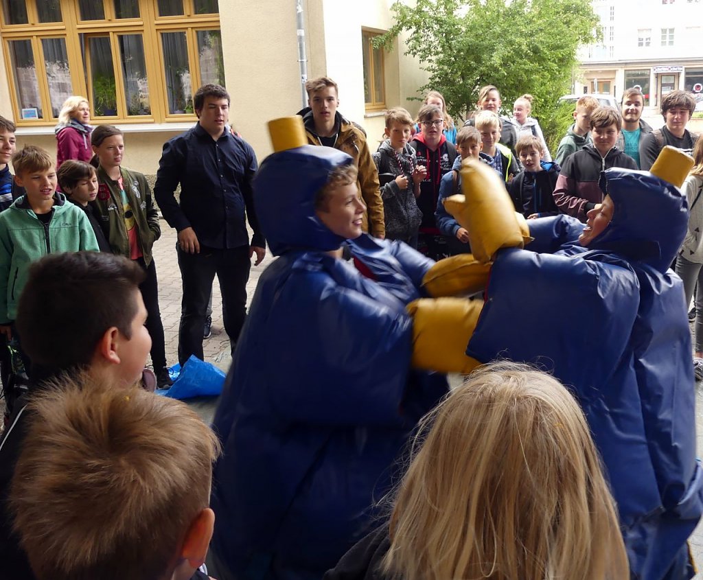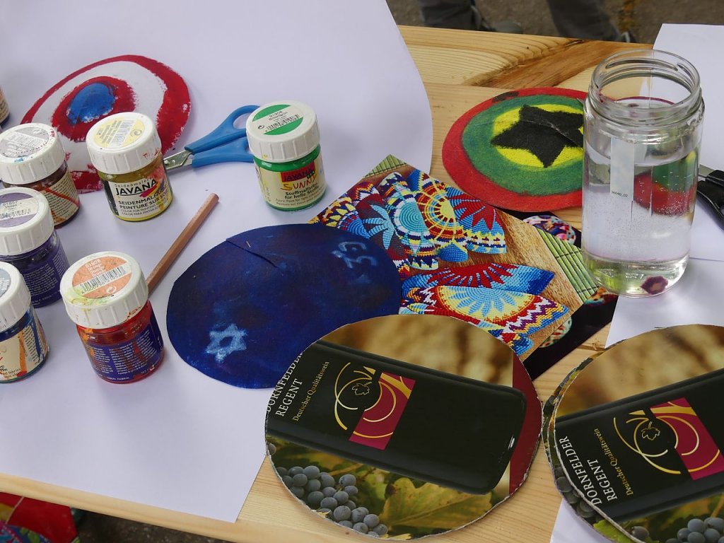 Auf dem anschließenden Markt der Möglichkeiten konnten sich dann noch einmal alle kreativ und aktiv erproben. Hübsche Mitbringsel wurden ebenso hergestellt, wie Kippot bemalt oder tatkräftig beim Sumoringen hingelangt wurde.