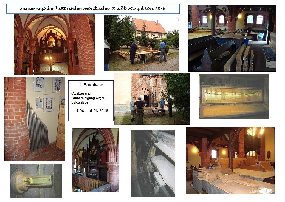 3 Mitarbeiter der Orgelbaufirma Hüfken aus Halberstadt begannen mit dem kompletten Ausbau der Pfeifen und aller weiteren zu reparierenden Teile des Instrumentes. Ebenfalls wurde mit der Reparatur der Balg- und Windanlage im Kirchturm begonnen. Unterstützung erhielten die Orgelbauer bei diesen Arbeiten von einigen engagierten Mitgliedern der Kirchengemeinde, welche speziell die Reinigung der Orgelpfeifen bzw. des Inneren der Orgel übernahmen. Alle Helfer staunten über die Tatsache, aus wie vielen Einzelkomponenten so eine Orgel besteht und was für eine handwerkliche Meisterleistung der Bau dieser Orgel vor 140 Jahren darstellte. Es entwickelte sich zwischen den Orgelbauern und Helfern eine sehr gute Zusammenarbeit , so dass die Arbeiten dieses 1. Bauabschnittes innerhalb von 4 Tagen bewältigt werden konnten. Alle ausgebauten Orgelpfeifen, sowie weitere ausgebaute Bestandteile der Orgel wurden danach in die Werkstatt des Orgelbauers nach Halberstadt gebracht, wo sie dann aufgearbeitet bzw. repariert werden. Der Wiedereinbau aller Komponenten der Orgel erfolgt dann im Anschluss an die Werkstattarbeiten im Spätsommer und die Kirchengemeinde hofft auf ein Ende der Arbeiten bis Ende Oktober diesen Jahres. Der Gemeindekirchenrat Görsbach bedankt sich an dieser Stelle bei der Gemeinde Görsbach, allen Helfern und allen Spendern, die es ermöglichten, dass jetzt die Restaurierung der Orgel beginnen konnte. In diesem Zusammenhang ebenfalls noch ein Dankeschön an die Kreissparkasse Nordhausen, die das Orgelprojekt auch mit einer Spende von 500 € unterstützte.