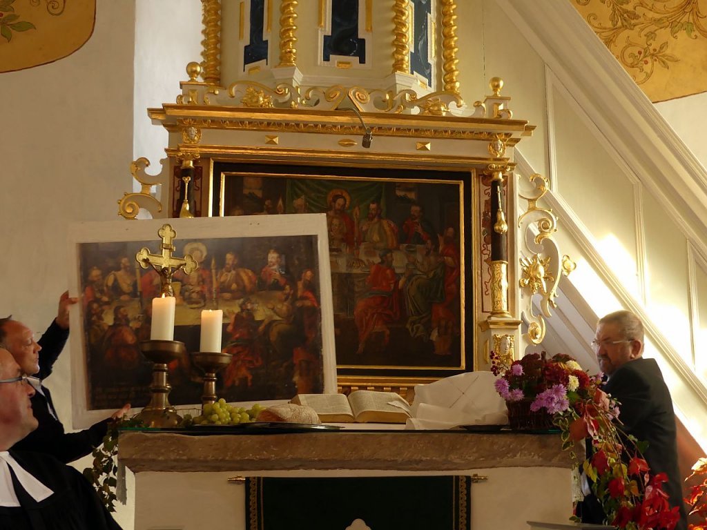 Lange Jahre hatte sich die Gemeinde mit einer Kopie zufrieden geben müssen. Nicht wissend, was sich unter ihrem alten Bild wirklich verbirgt und wie man das Geld für eine Restaurierung zusammenbekommen sollte. Schließlich sanierte die Gemeinde die 1.000-jährige Kirche seit 2016 grundhaft. Erst im letzten Jahr wurde die Orgel wieder in Betrieb genommen. Insgesamt eine große Leistung, bei der viele mithalfen, wie Pfarrer i.R. Ehrhart Neubert erinnerte. Letztlich übernahm die Deutsche Stiftung Denkmalschutz die Kosten für die Restaurierung des Altarbildes, bedankte er sich im Gottesdienst.