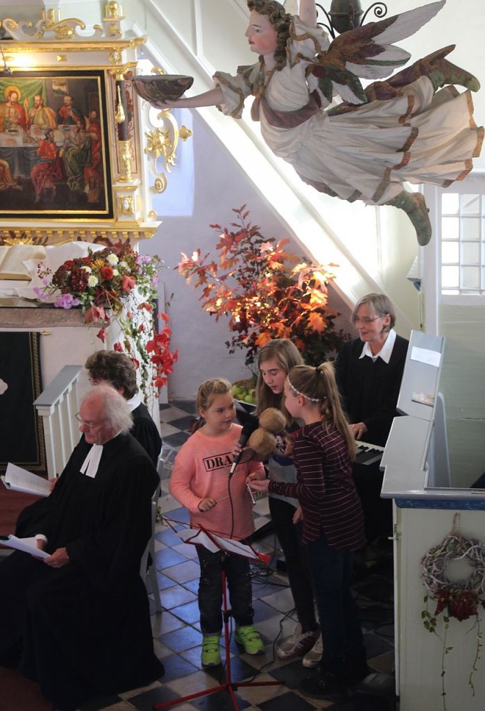Drei junge Damen rappten ein nachdenklich stimmendes Erntedanklied und bekamen spontanen Applaus. Als Pfarrer i.R. Neubert monierte, dass er noch nie Applaus für eine Predigt bekommen habe, da klatschten die Anwesenden vorab. Doch als sie auch nach der Predigt applaudierten, war Pfarrer i.R. Neubert doch ein wenig freudig irritiert. Und kam glatt aus dem wohldurchdachten Konzept.