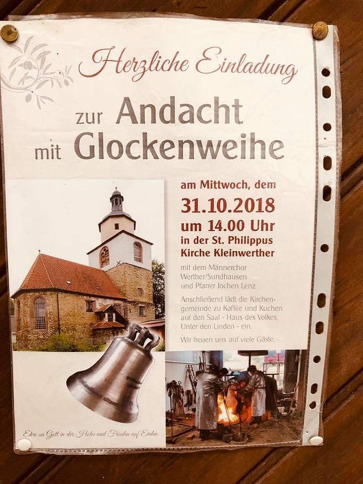 Was für ein bewegender Moment: Eine neue Glocke wird von nun an und über siebzig Jahre nach dem Krieg wieder in Kleinwerthers Kirchturm läuten! Am Reformationstag um 14.00 Uhr wird dort ein Glockenfest gefeiert. Herzliche Einladung!