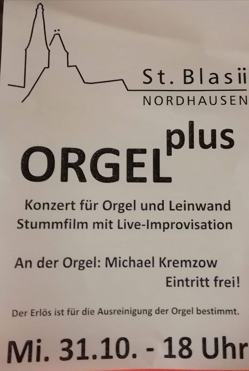 "Der Film "Der Galiäer" aus dem Jahr 1922 behandelt die Leidensgeschichte Jesu und ist trotz seiner Kürze durchaus als monumental zu bezeichnen. Stilistisch angelehnt an die Passionsspiele Oberammergau sind die letzen Stationen im Leben Jesu Christi in fünf kurzen Akten dargestellt, die jedoch in Auswahl zu sehen sein werden. Zudem erklingt im Rahmen dieses Konzertes die Geschichte "Leb wohl, lieber Dachs" - gelesen von Elisabeth Krieger, musikalisch illustriert mit Musik von Johannes Brahms und Maurice Duruflé. Zusammengestellt und arrangiert hat die Musik der Kantor der Blasiikirche Nordhausen, Michael Kremzow. Der Eintritt zu diesem Konzert ist frei! Der Erlös kommt der Ausreinigung der Orgel zugute."