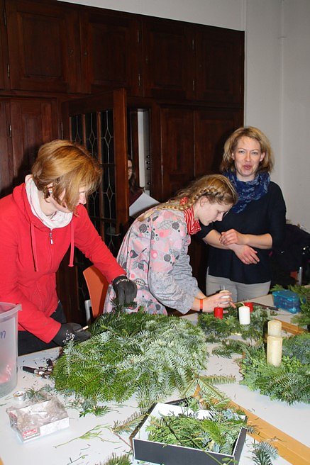 In gemütlicher Runde findet unter fachlicher Anleitung von Floristin Viola Schumann das diesjährige Adventskranz-Binden wieder am Vortag des 1. Advent: