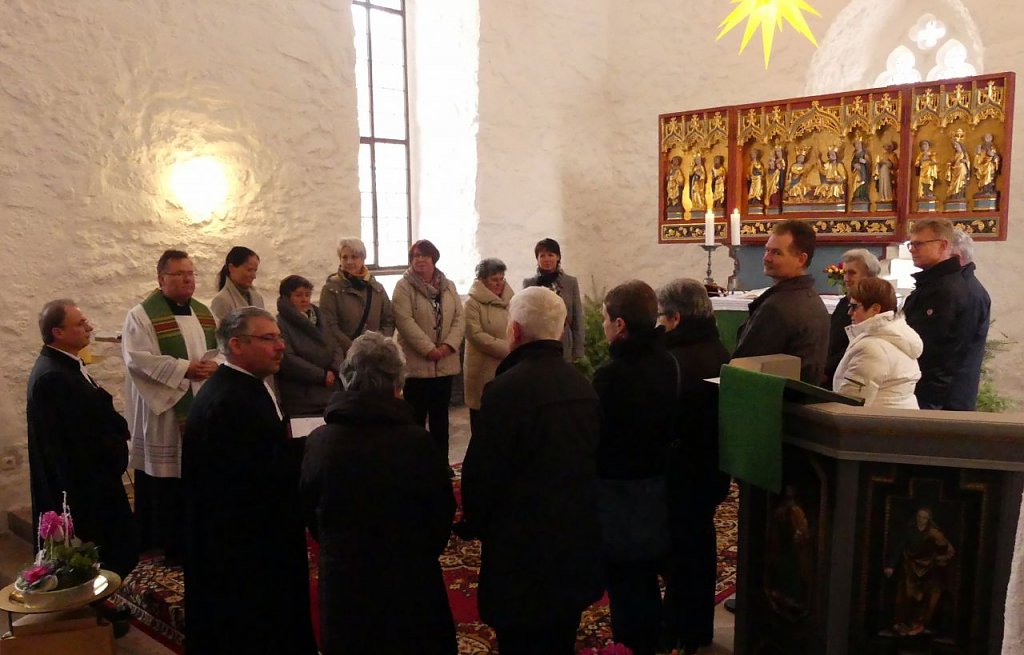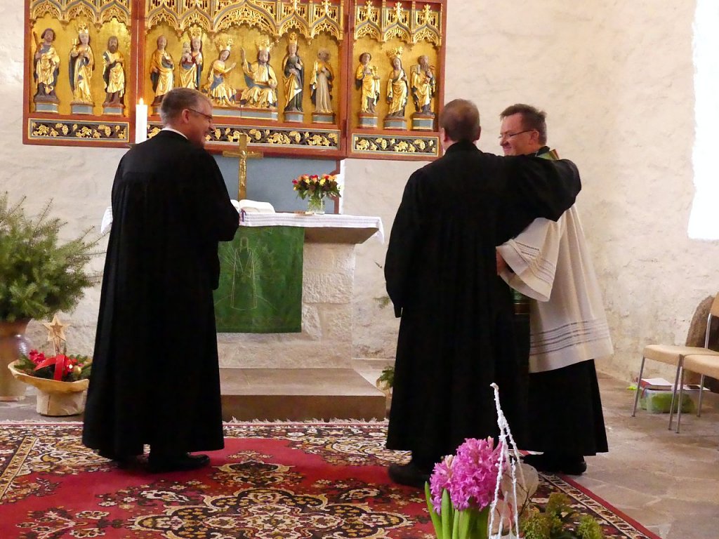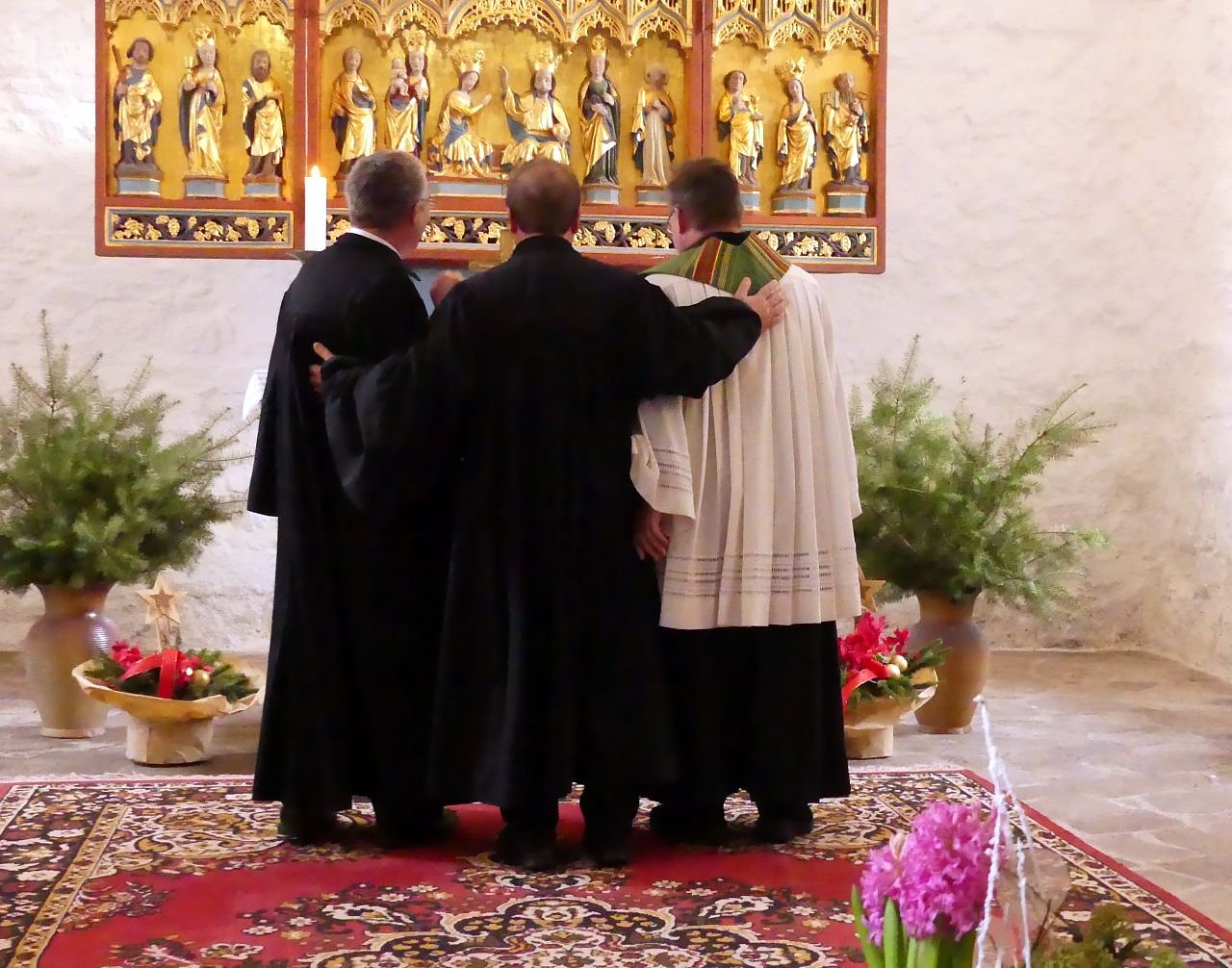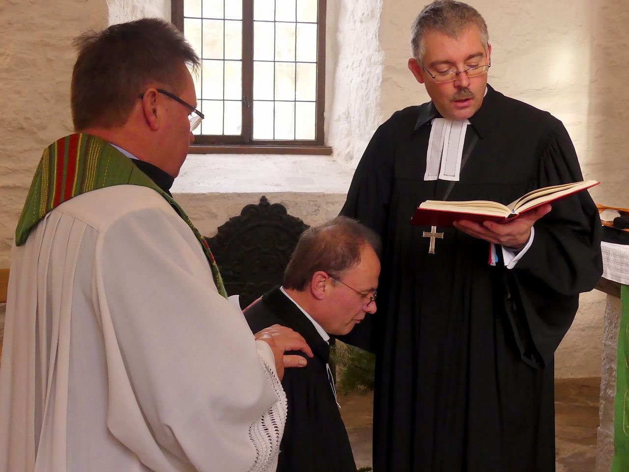 Dompfarrer Richard Hentrich übernahm im Gottesdienst die Lesung. Der darüber teils erstaunten Gemeinde erklärte er die Thüringer Besonderheit, dass sich katholische und evangelische Geistliche gegenseitig bei den jeweiligen Amtseinführungen besuchen. Gemeinsam mit Superintendent Schwarze legte er dann auch Pfarrer Lenz die Hand zum Segen auf. Als die drei gegen Ende des Gottesdienstes Arm in Arm vor dem Altar standen, da war dies ein starkes Bild für die anwesenden Christen.
