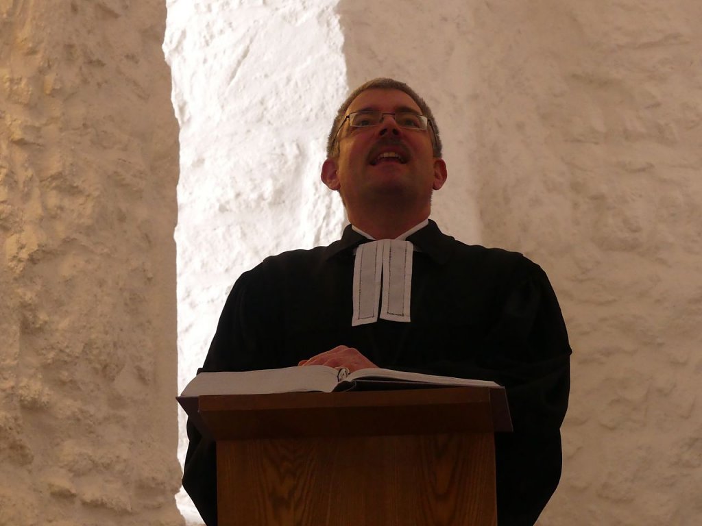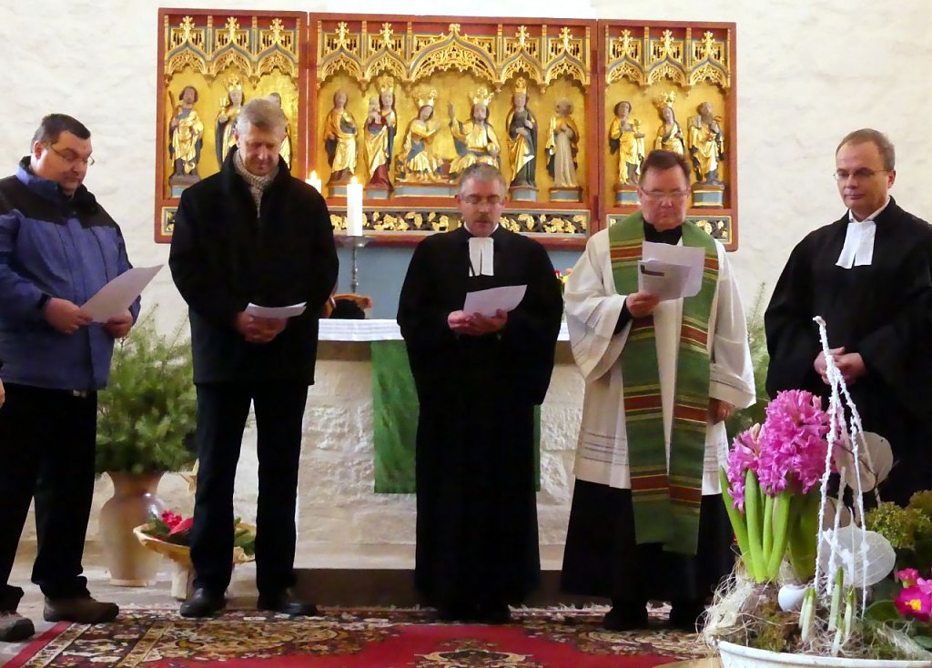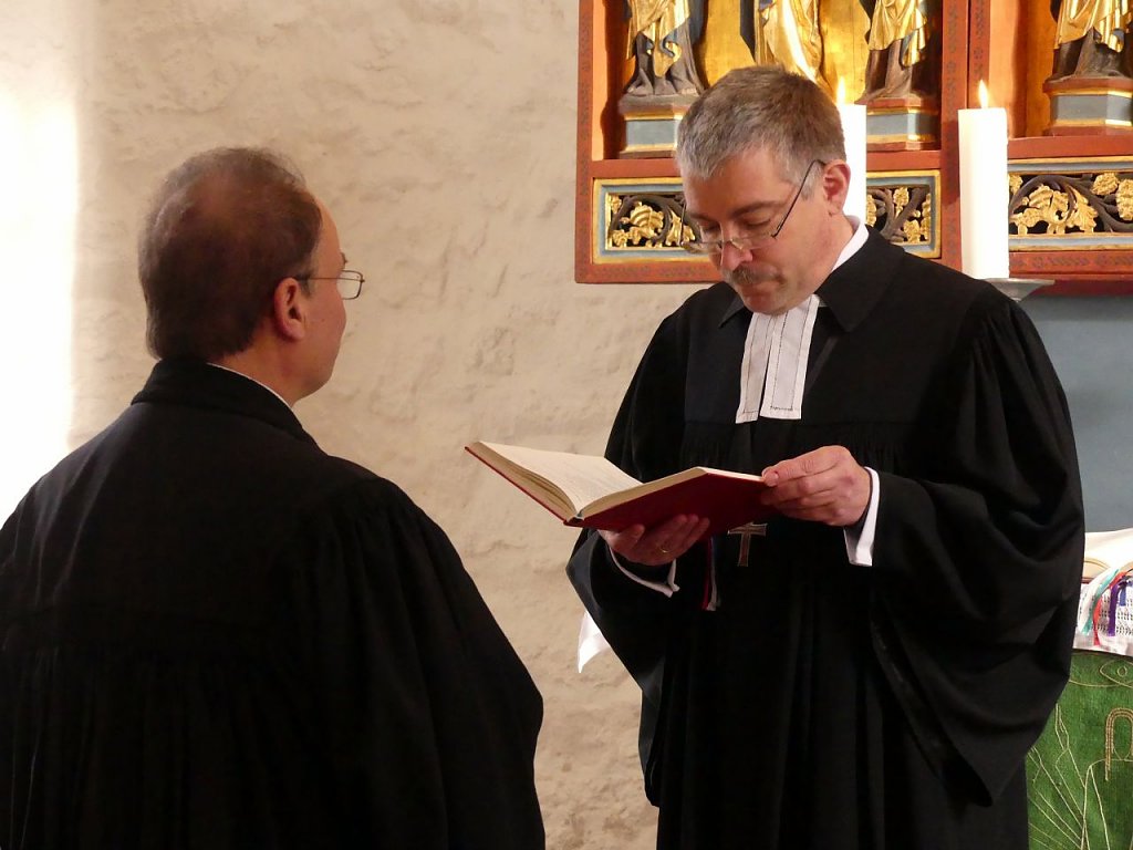 Der einzige, der den Gottesdienst nur schweigend verfolgen konnte, war ausgerechnet der schwer erkältete neue Ellricher Pfarrer Jochen Lenz. Seiner krächzenden Stimme gelang gerade noch ein heiseres Ja, mit Gottes Hilfe auf die Einführungsfrage hin, ob er bereit sei, den Dienst in den Gemeinden zu übernehmen.
