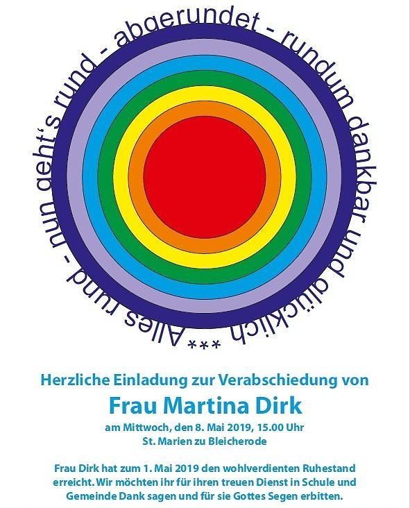 Am 8. Mai verabschieden wir Martina Dirk um 15 Uhr in der Bleicheröder St. Marien-Kirche in den wohlverdienten Ruhestand und bitten für sie um Gottes Segen.