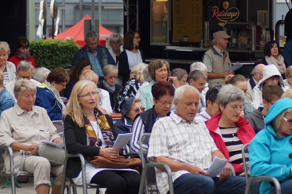 Der Rolandgottesdienst war wie immer ein wirklich schöner ökumenischer Höhepunkt (neben dem WGT, der Bibelwoche und der Friedensdekade) in unserer Stadt. Das Wetter hat uns keinen Strich durch die Rechnung gemacht, obwohl das dem Fisch Jona, der die Bühne am Theater zierte, wohl gut getan hätte. Dieser besondere Riese hat der Predigt den Rahmen zu verschiedenen Bildern, beziehungsweise Lesungsabschnitten gegeben. Als Predigttext wurde von Thomas Kohl die wunderbare Ballade von Klaus-Peter Hertzsch gelesen und das war in seiner basstiefen Stimme ein Hörgenuss. Das Pfarrehepaar von Biela verstand es, entsprechend des Balladentextes, mit seinem klaren Blick auf den Bezug in das jetzt und heute, alle Gottesdienstbesucher zu fesseln.