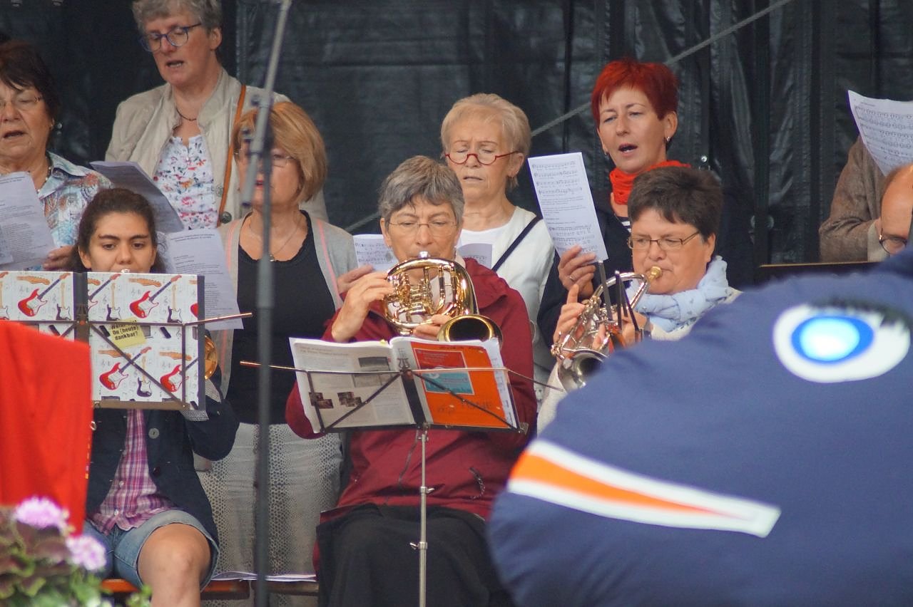 Umrahmt haben diesen Gottesdienst Mitglieder der Kantorei und der Posaunenchor unter der Leitung von Kantor Michael Kremzow sowie Matthias Weicker und Thomas Kohl als Bandunterstützung mit richtigem Kirchentagsfeeling.